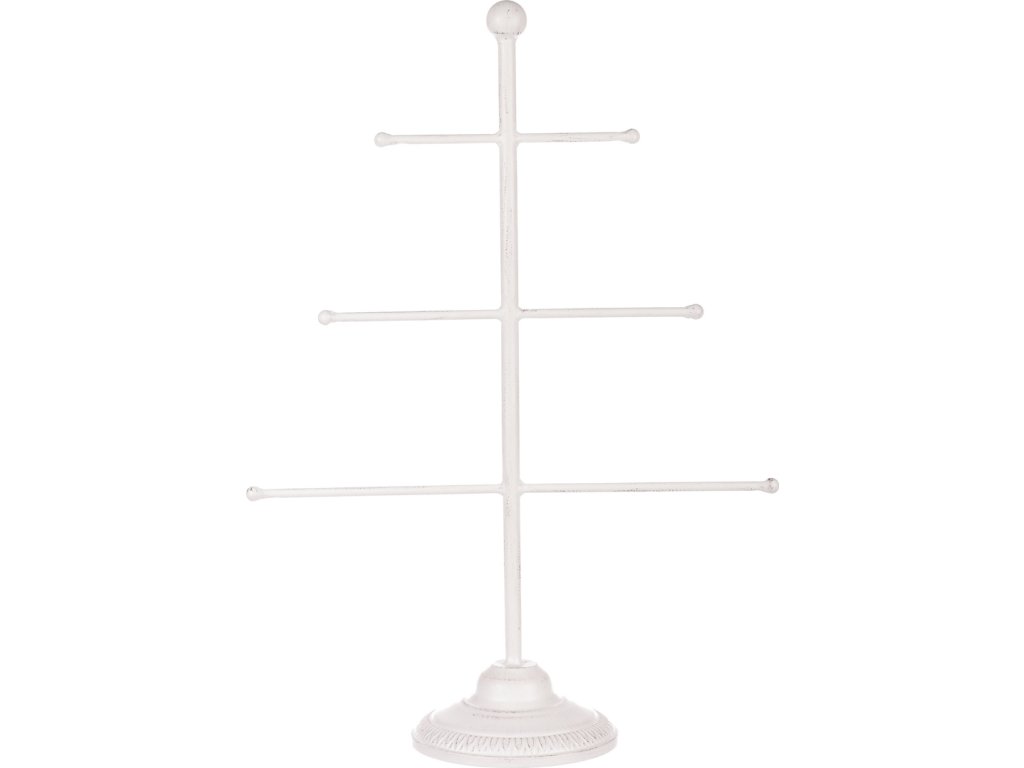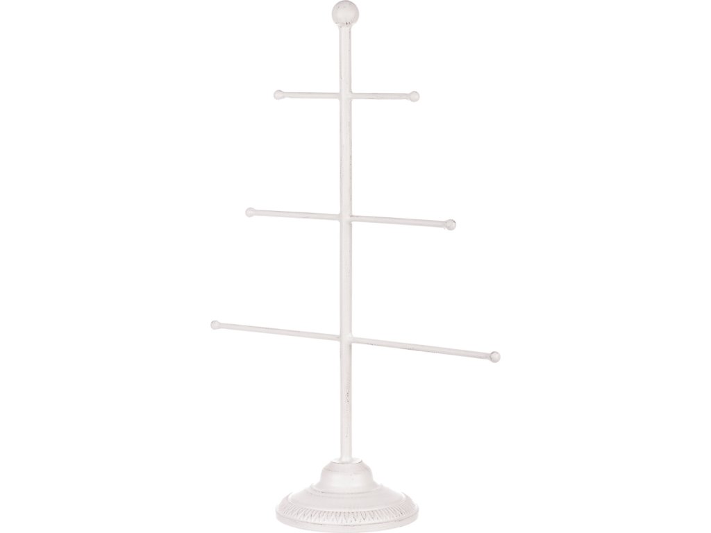 Tento kovový stojan s příčkami v bílé barvě je praktickým a všestranným řešením pro zavěšení různých praktických předmětů, případně i dekorací. Konstrukce je složena z jedné nohy na podstavci, a zbytek tvoří vodorovné tyče ve třech různých výškových úrovních zakončené kulatým koncem. Horní závěsná tyč je nejkratší a každá další spodnější je delší. Doporučuje se tak rovnoměrné zatížení obou stran stojanu, aby byla zajištěna jeho stabilita. Tento stojan vám pomůže udržovat věci dobře uspořádané a přehledné.