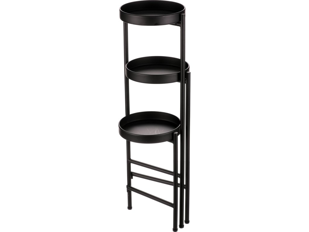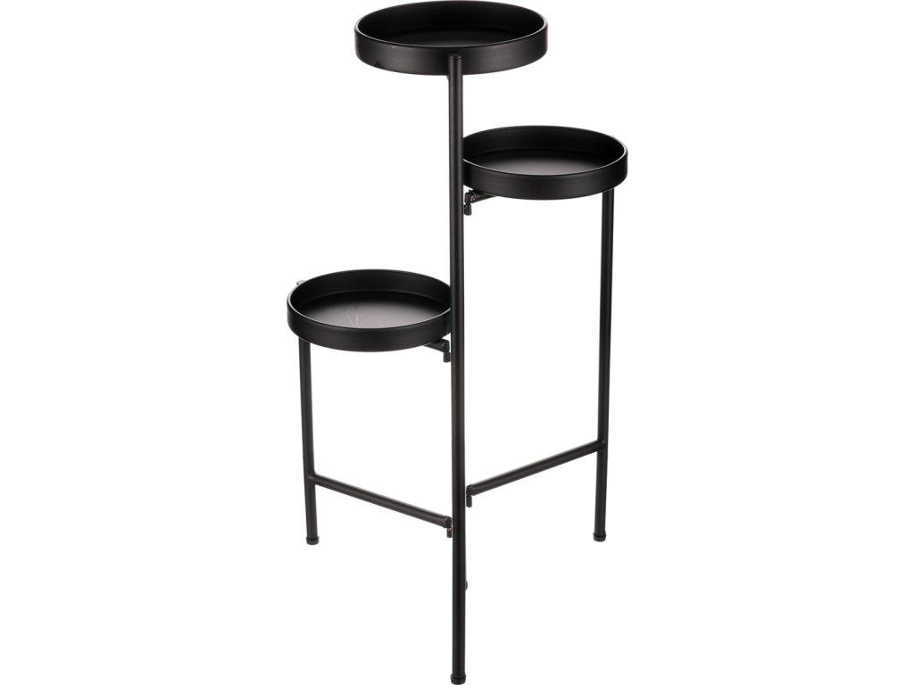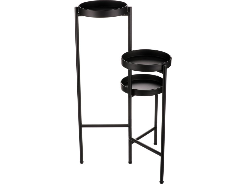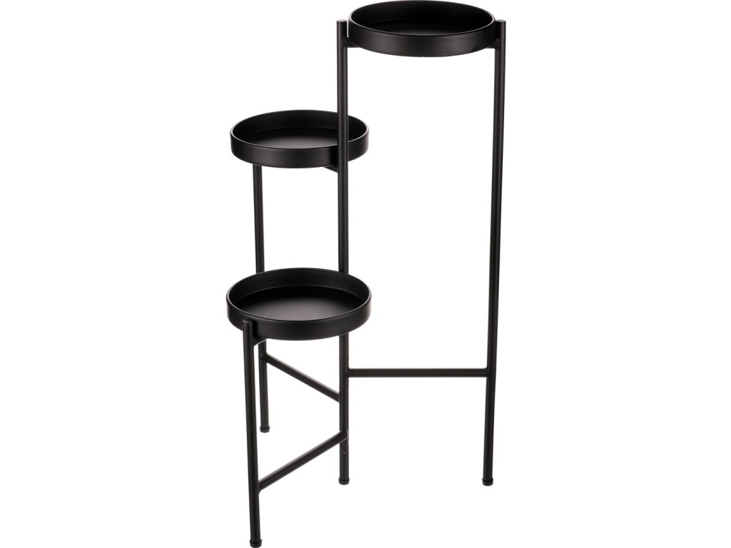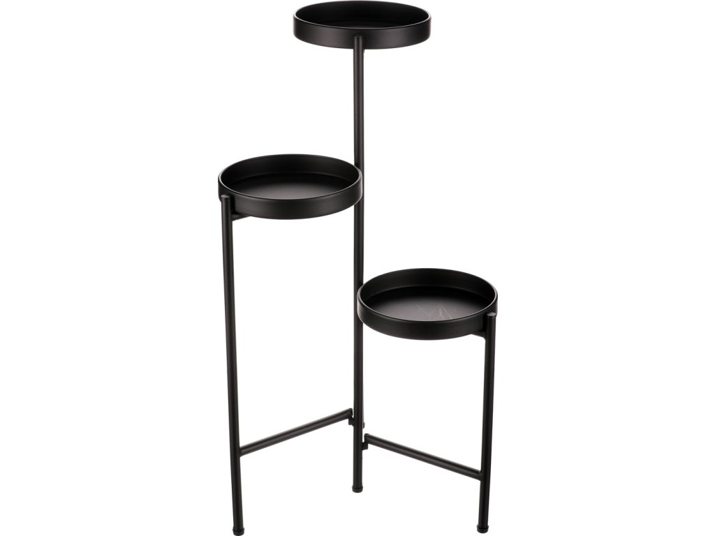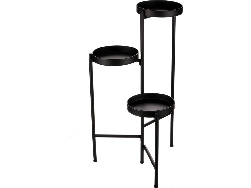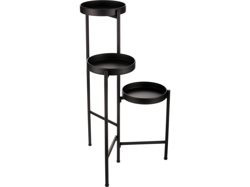 Bytový doplněk v podobě kovového stojanu v černé barvě bude skvělým pomocníkem pro prostorové umístění květin. Skládá se ze tří nosných ploch v různých výškách. Svým provedením je uzpůsoben pro umístění v rohu místnosti. Můžete tak krásně využít této mnohdy problematické plochy a terasovitě nechat vyniknout krásu rostlin na něm umístěných.