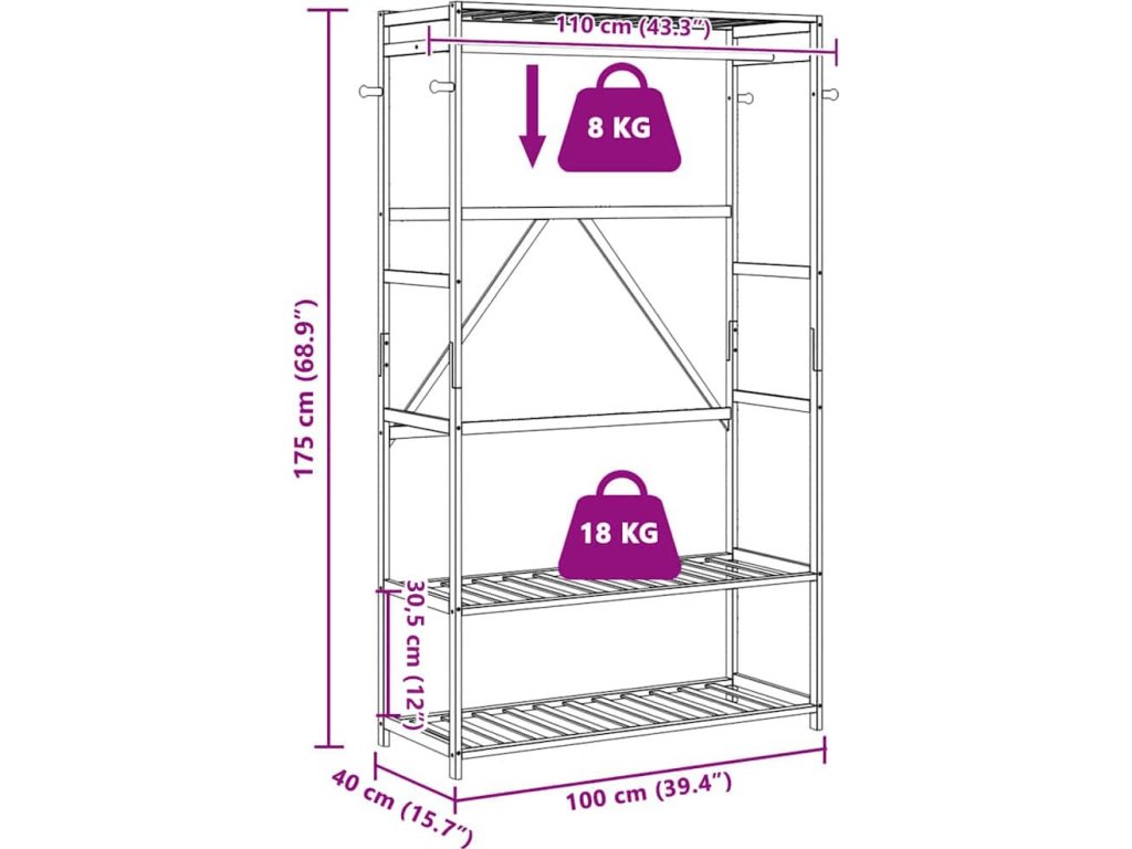 - Dostatek úložného prostoru: Věšák je vybaven závěsnou tyčí pro uspořádání oblečení, díky níž máte vše snadno po ruce. Police jsou ideální pro ukládání krabic a složených oděvů, zatímco spodní police poskytuje prostor pro boty. Boční háčky navíc poskytují pohodlné místo pro zavěšení kabelek a klobouků.