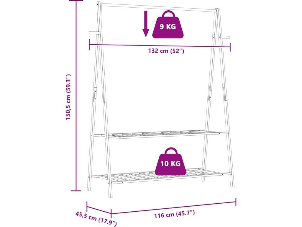 - Dostatek úložného prostoru: Věšák je vybaven závěsnou tyčí pro uspořádání oblečení, díky níž máte vše snadno po ruce. Horní police je ideální pro ukládání krabic a složených oděvů, zatímco spodní police poskytuje prostor pro boty. Boční háčky navíc poskytují pohodlné místo pro zavěšení kabelek a klobouků.