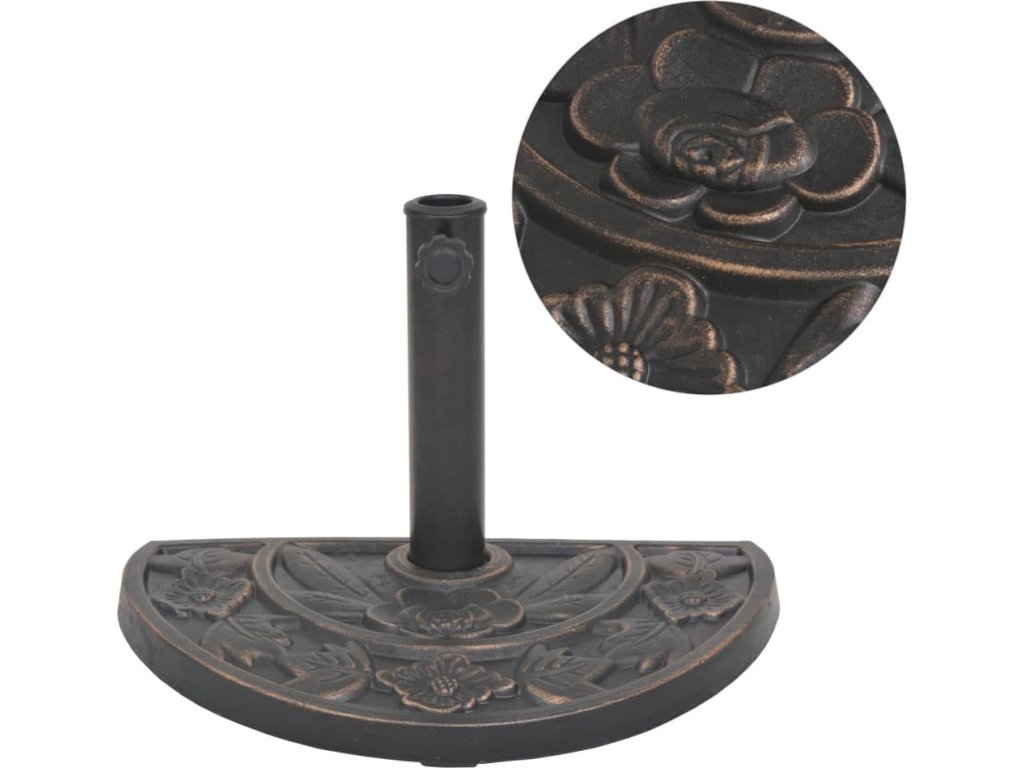 Tento vysoce dekorativní podstavec pod slunečník je vyroben z pryskyřice, odolné vůči nepřízni počasí, ale přitom vypadá, jako by byl odlit z bronzu. Má pojistný šroub, který udrží tyč slunečníku na místě v 57 mm široké trubce. Dva adaptéry jsou rovněž přiloženy, aby byl stojan vhodný pro slunečníky s průměrem tyče 38 a 48 mm.