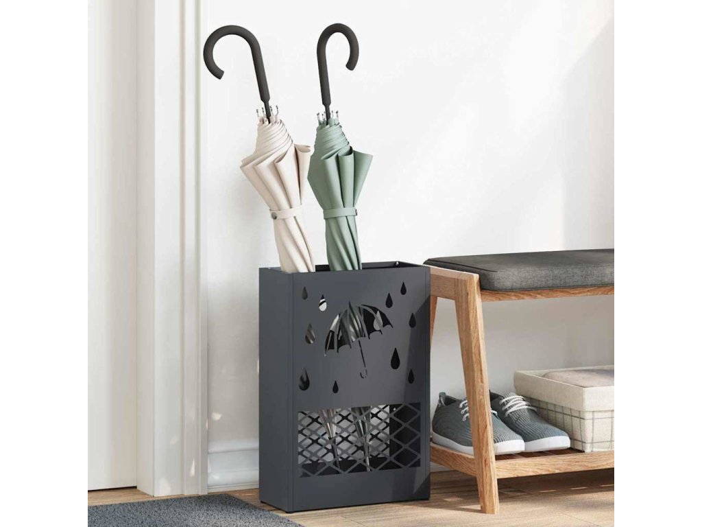 Tento moderní stojan na deštníky s úložným prostorem spojuje styl s funkčností, takže vaše předsíň zůstane uspořádaná a bez nepořádku. Díky elegantnímu obdélníkovému tvaru skvěle ladí s moderními trendy a přidává špetku jednoduchosti a elegance. Robustní ocelový rám zajišťuje potřebnou oporu a trvanlivost, což z něj dělá funkcionalitu do každého vchodu.