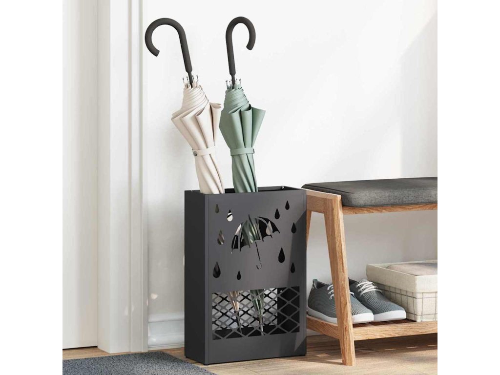Tento moderní stojan na deštníky s úložným prostorem spojuje styl s funkčností, takže vaše předsíň zůstane uspořádaná a bez nepořádku. Díky elegantnímu obdélníkovému tvaru skvěle ladí s moderními trendy a přidává špetku jednoduchosti a elegance. Robustní ocelový rám zajišťuje potřebnou oporu a trvanlivost, což z něj dělá funkcionalitu do každého vchodu.
