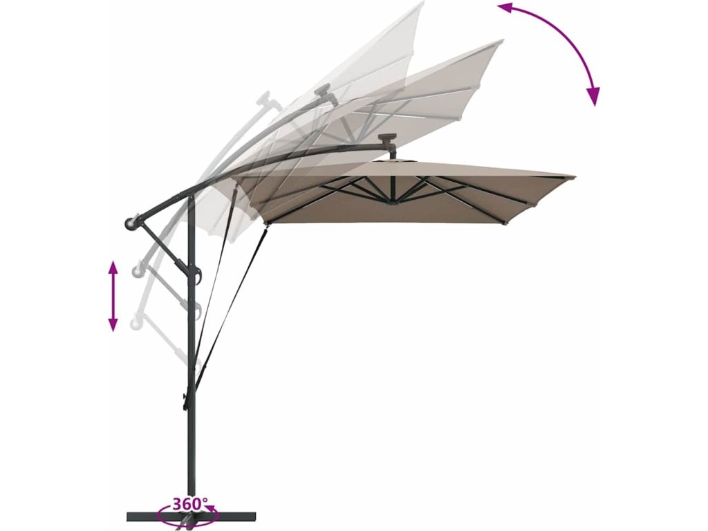 - 360° nastavení: Pokročilé naklápění a otáčení deštníku vám nabízí maximální flexibilitu. Můžete si snadno nastavit stín podle potřeby, a přizpůsobit se tak slunečním podmínkám během dne.