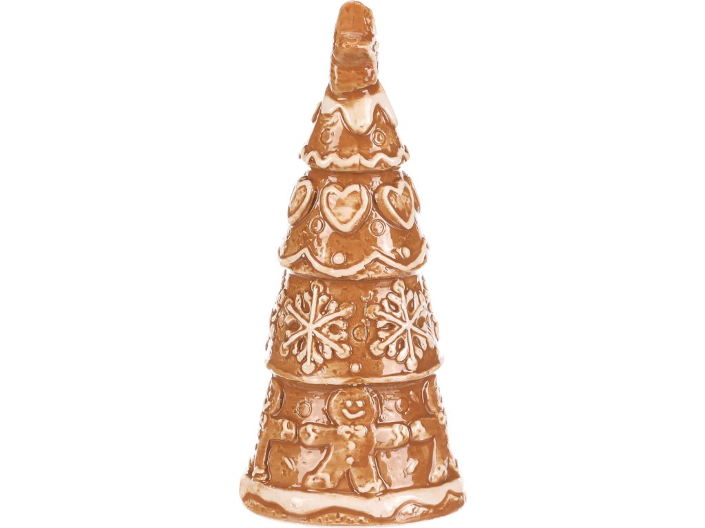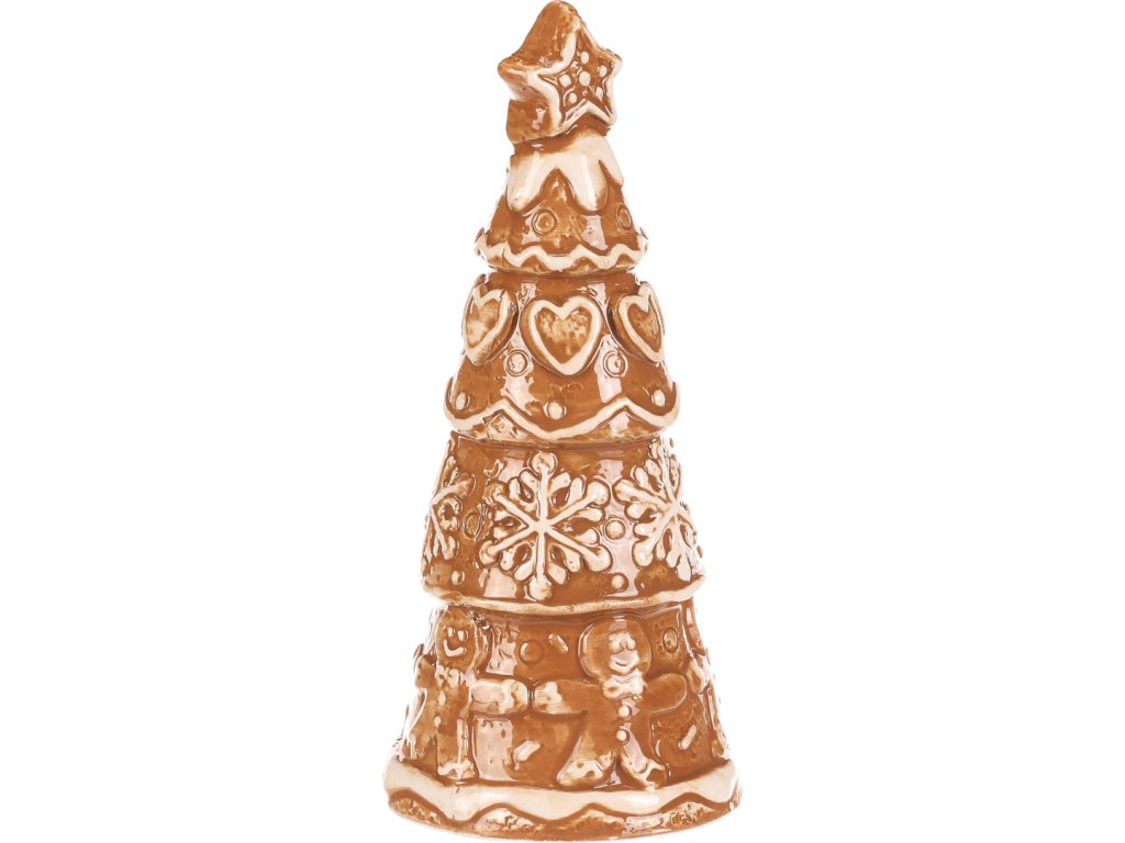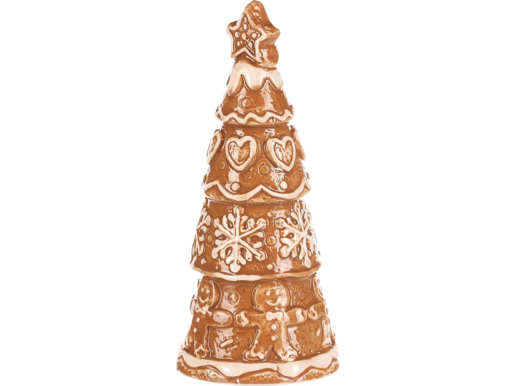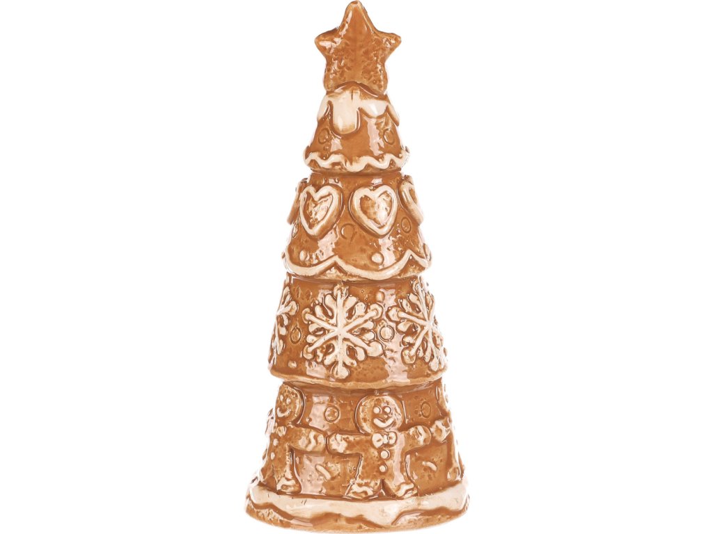 Keramický perníkový stromek s hvězdou na špici vypadá jako opravdová vánoční lahůdka. Hnědý povrch s bílou polevou zdobí roztomilá srdíčka, sněhové vločky a panáčci, což mu dodává pohádkový vzhled. Skvělá dekorace, která přinese kouzlo Vánoc do každého prostoru.