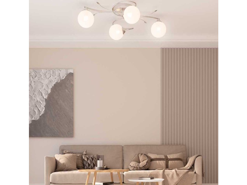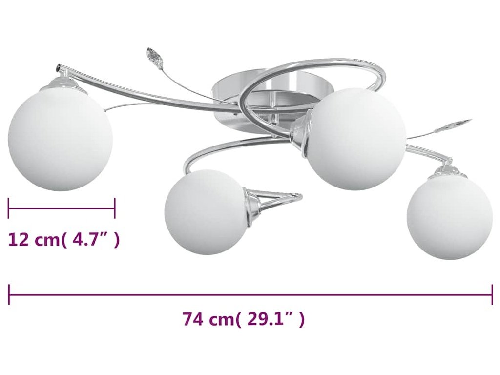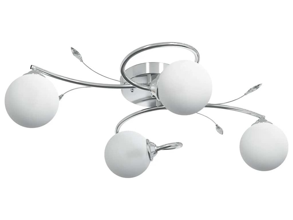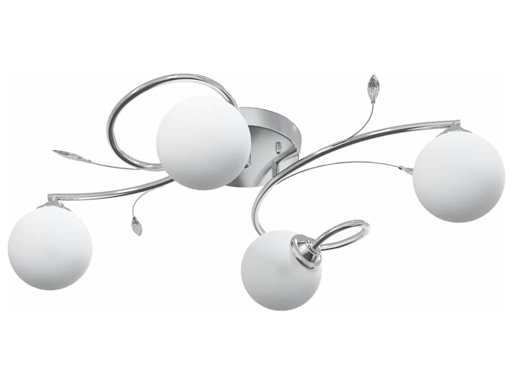 Toto jedinečné stropní svítidlo s elegantními akrylovými dekoracemi ve tvaru listů a 4 sférickými skleněnými stínidly je skvělým doplňkem do každého obývacího pokoje nebo ložnice.