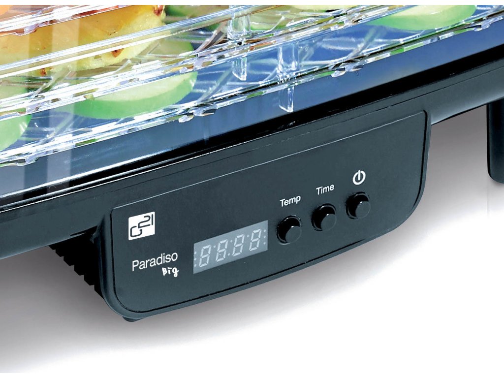 Teplotu sušení můžete zvolit v rozpětí od 40 do 70 °C. Doporučenou dobu sušení nastavíte na časovači, který díky funkci “automatické vypnutí” sušičku po stanovené době sám vypne. Nastavení i zbývající čas sušení můžete sledovat na digitálním displeji. Ovládání je proto velmi snadné a pohodlné. Sušičku G21 Paradiso Big skutečně hlídat nemusíte. Dělá to, co má. Suší.