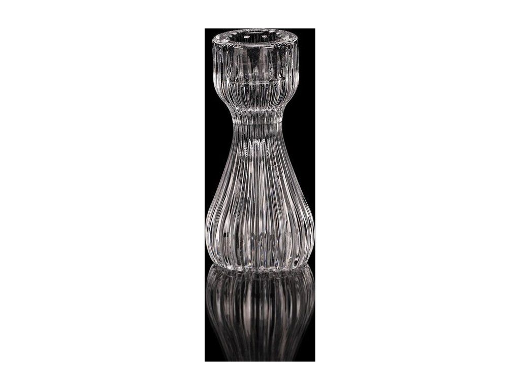 Skleněný svícen na kónickou svíčku s výškou 10,5 cm z čirého broušeného skla. Jeho jedinečný design vynikne v každém interiéru, a díky své hmotnosti bude stabilní a bezpečný pro ozdobení stolů a poliček. Jedná se o působivou dekoraci, která po zapálení svíčky rozzáří prostor neodolatelnými třpytivými odlesky všemi směry.