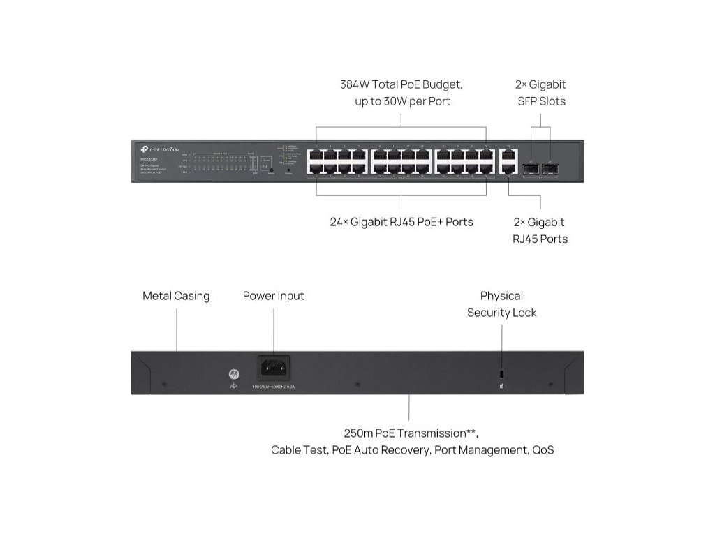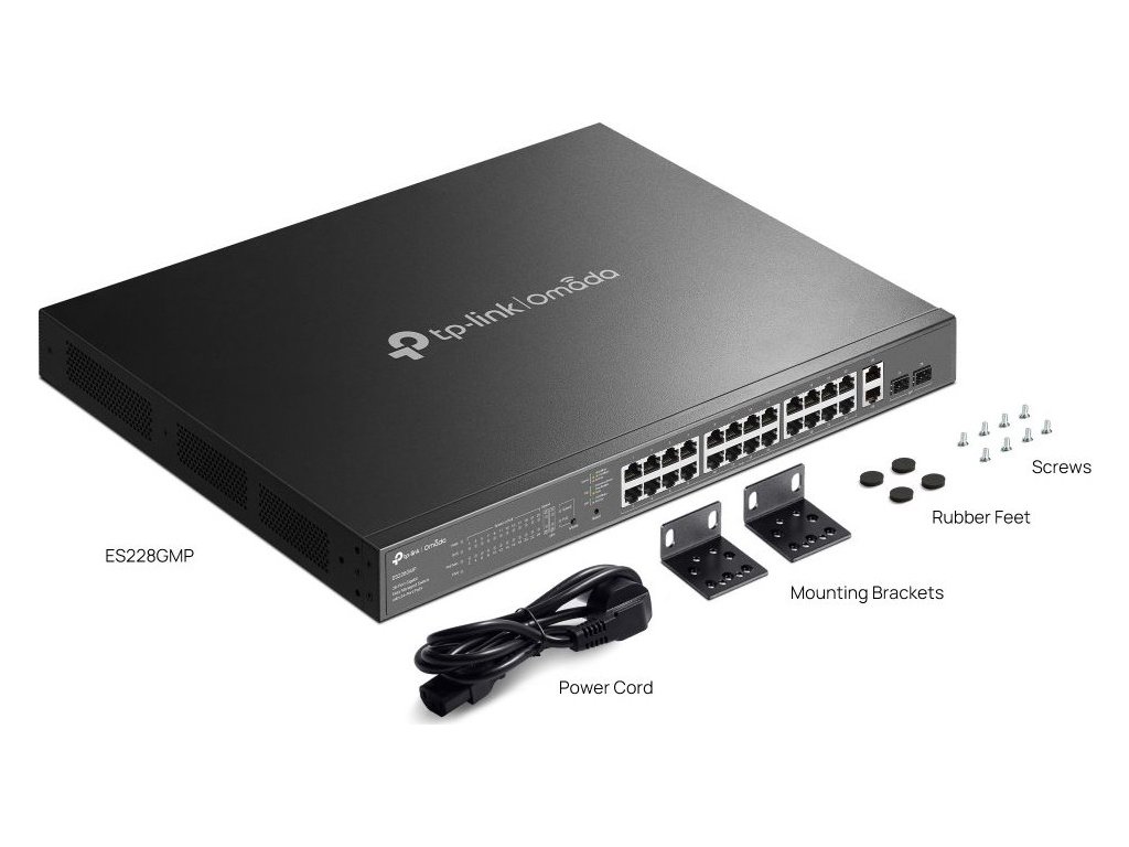 Switch TP-Link ES228GMP využijete v kanceláři, pro maloobchod, univerzitní areál či pohostinství. Zajistí vám vysokorychlostní a spolehlivé spojení s dalšími switchi a zařízeními. Je navíc kompatibilní s IP kamerami, přístupovými body a zařízeními bez PoE (tiskárny a počítače). Najdete na něm celkem 26 10/100/1000Mb/s RJ45 portů a 2 gigabitové SFP sloty. Jejich celkový rozpočet je 384 W, na každý port pak připadá až 30 W.