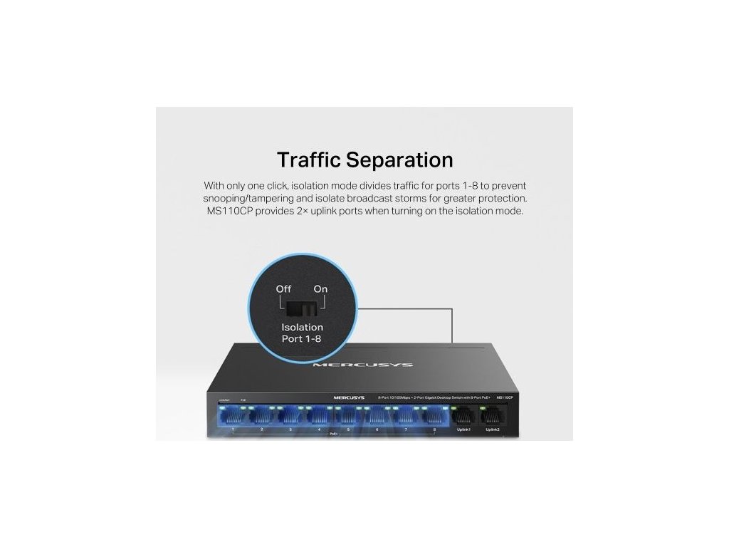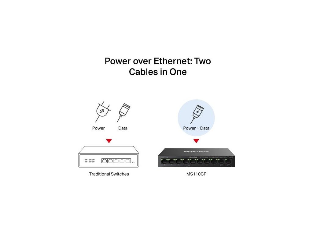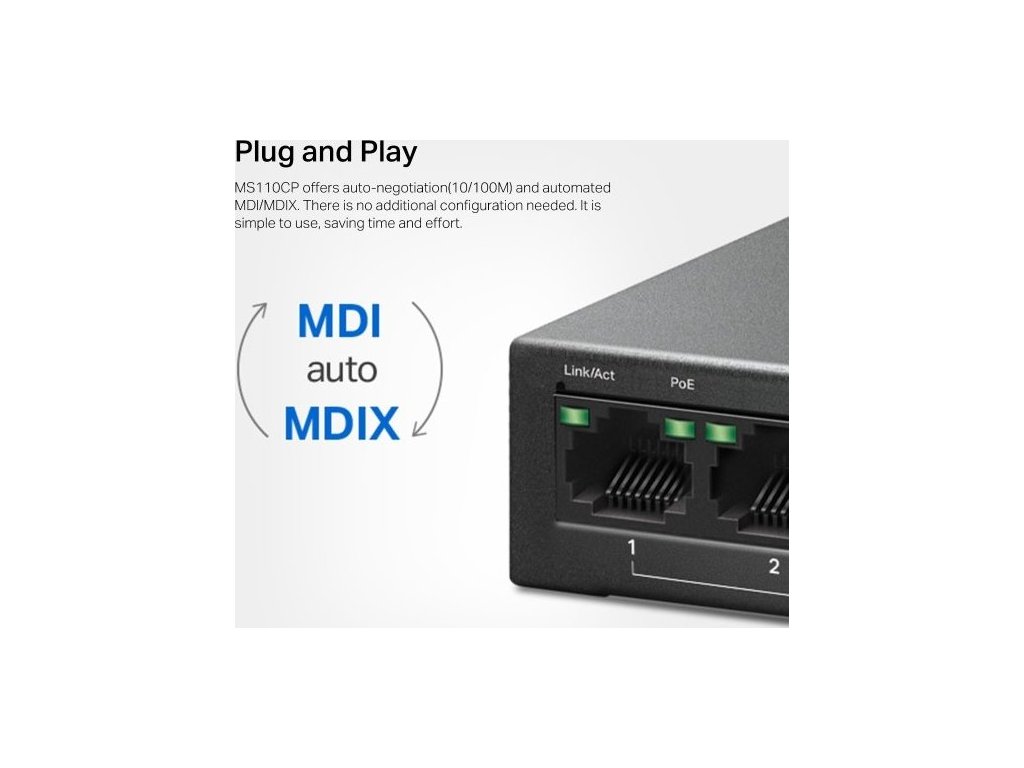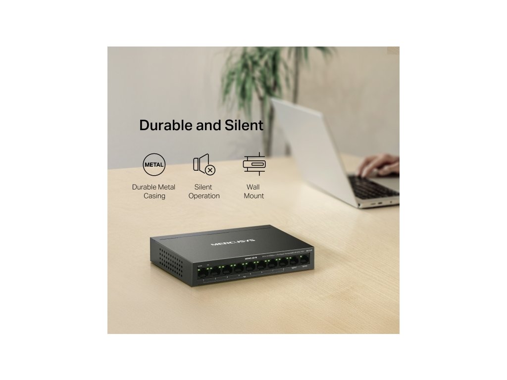 Se switchem Mercusys MS110CP od TP-Link získáte stabilní připojení, které se hodí hlavně v menších firmách, ubytovnách nebo kancelářích. Poskytne vám osm 10/100Mbps portů PoE+ a 2 gigabitové porty bez PoE. K napájení a přenosu dat vám postačí jeden ethernetový kabel. Jistě vás potěší také tichý chod a nízká spotřeba energie díky bezventilátorovému provedení. Odolný kovový kryt dobře odvádí teplo.