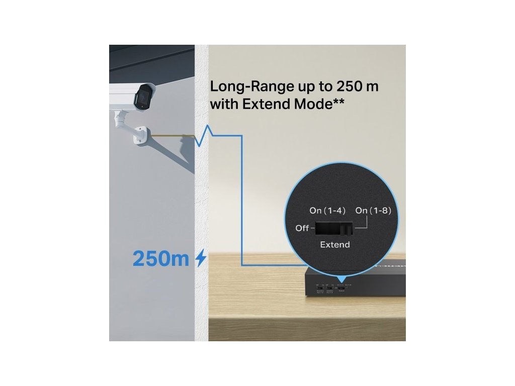 Zařízení poskytuje v režimu Extend dosah přenosu PoE až 250 metrů. V režimu izolace si zase jediným kliknutím můžete rozdělit provozní zátěž, čímž si zajistíte bezpečné a stabilní připojení. Při zapnutí tohoto režimu máte k dispozici 2 Uplink porty. Jeden slouží pro připojení k internetu, druhý pro připojení k NVR.