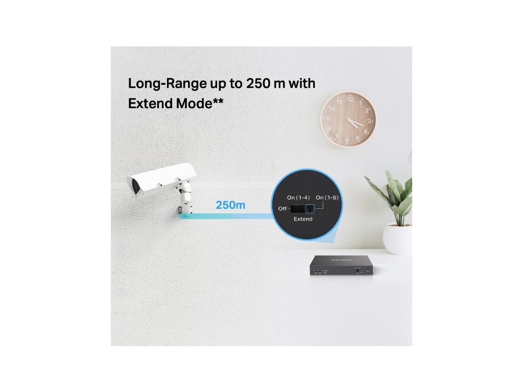 Zařízení poskytuje v režimu Extend dosah přenosu PoE až 250 metrů. V režimu izolace si zase jediným kliknutím můžete rozdělit provozní zátěž a přiřadit prioritu pro jednotlivé porty. Tím získáte potřebnou stabilitu a zabezpečíte své připojení proti neoprávněné manipulaci.
