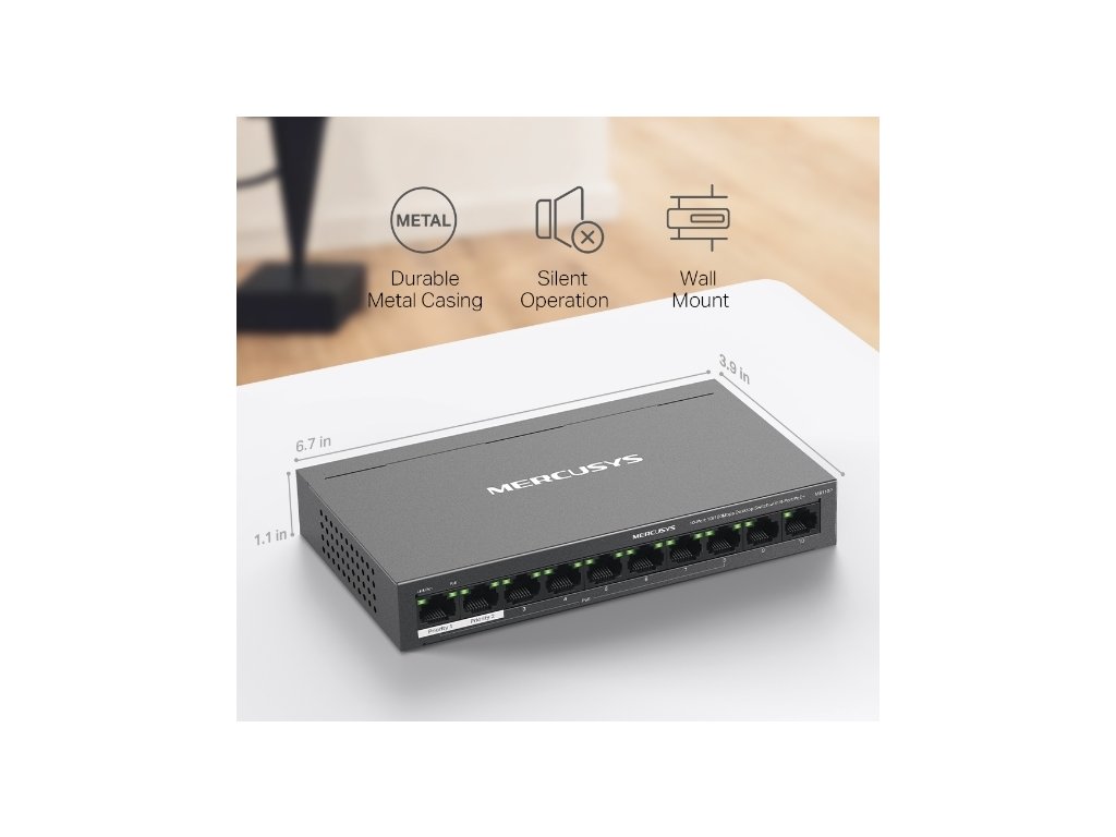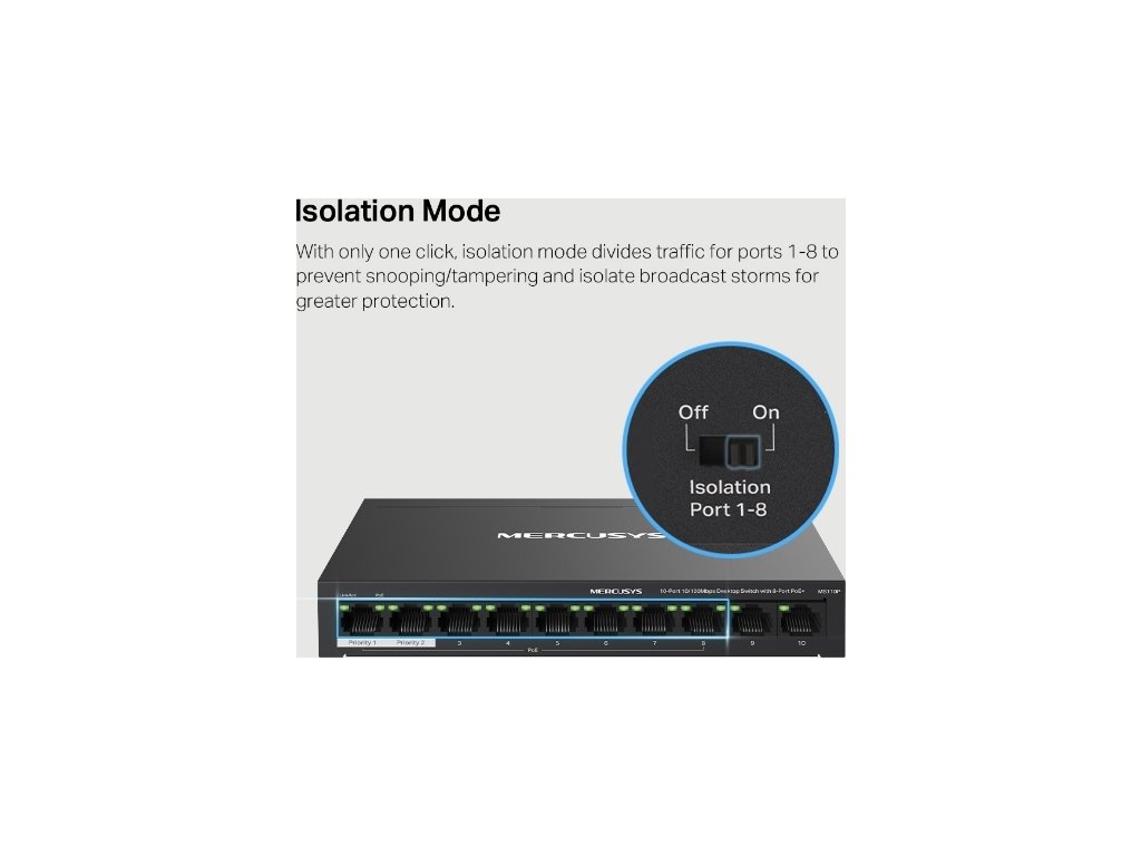 Se switchem Mercusys MS110P od TP-Link získáte stabilní připojení, které se hodí hlavně v menších firmách, ubytovnách nebo kancelářích. Poskytne vám 10 portů 10/100 Mbps, z nichž 8 umožňuje připojení PoE+. Zbylé 2 uplink porty slouží v režimu izolace pro připojení k internetu a NVR. K napájení a přenosu dat vám postačí jeden ethernetový kabel.