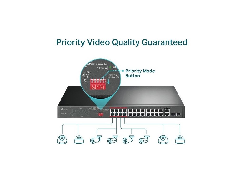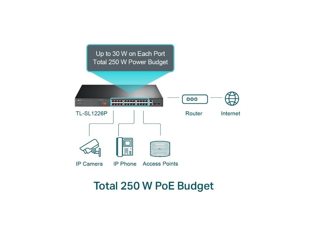 Výkonný PoE přepínač TP-LINK TL-SG1226P nabízí 24 Fast Ethernet RJ-45 portů s podporou PoE+, 2 SFP/RJ-45 Combo porty a 2 Gbit SFP sloty. Tento desktopový switch přenáší napájení i data jediným kabelem přímo k danému koncovému zařízení – Wi-Fi AP, IP kamera, IP telefon, IP systém do autobusů nebo různé senzory pro automatizaci budov či správu vozového parku. Jedná se tak o skvělý doplněk pro rozšíření počítačové sítě v malých i středních firmách.