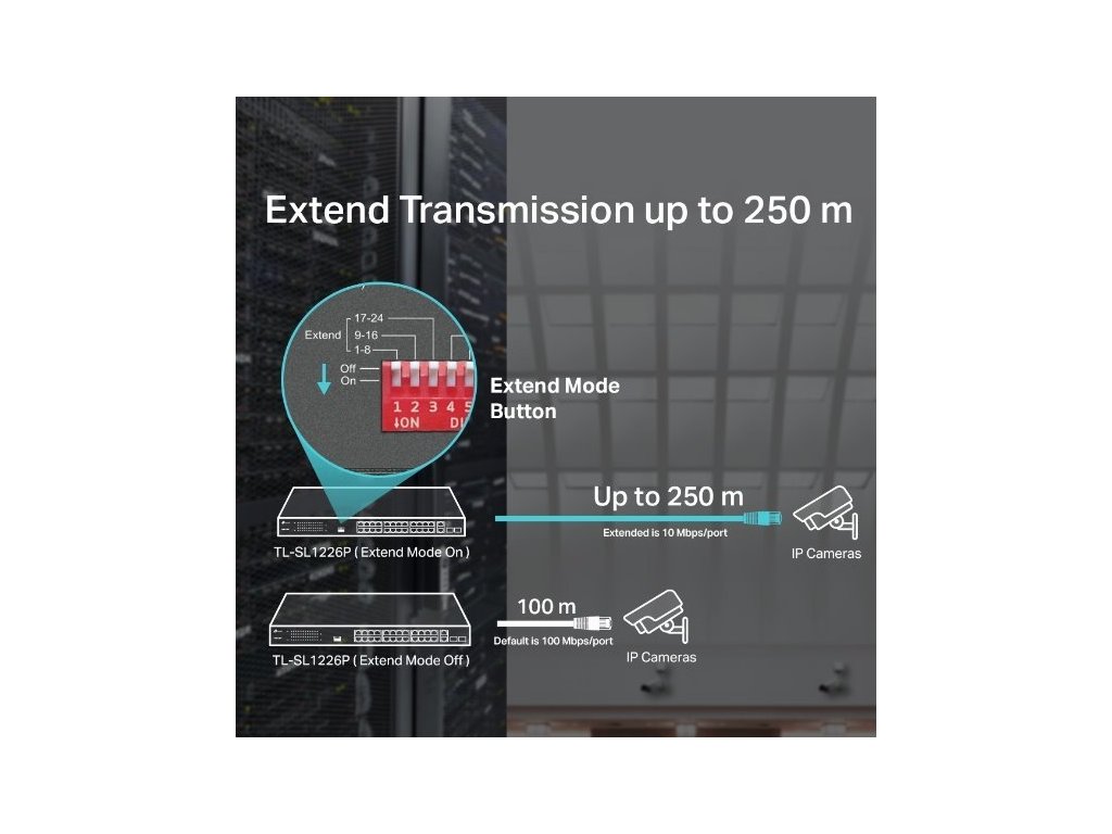 Switch umí pracovat v takzvaném extend režimu. V něm pro vybrané skupiny portů dokáže prodloužit dosah pro kompatibilní napájení zařízení (typicky PoE kamery) až o 250 metrů. Přenosová rychlost činí v tomto případě 10 MB/s.