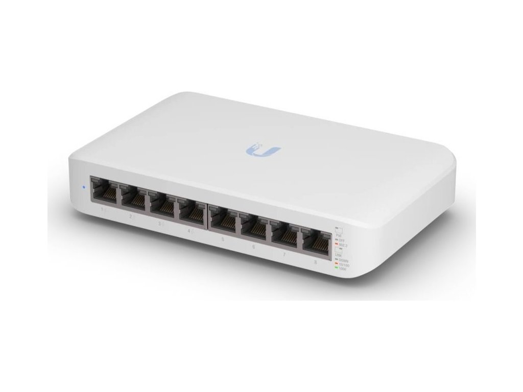 - Switch Ubiquiti USW-Lite-8-PoE pracuje na 2. vrstvě OSI modelu, takže přepíná síťovou komunikaci podle fyzických (MAC) adres