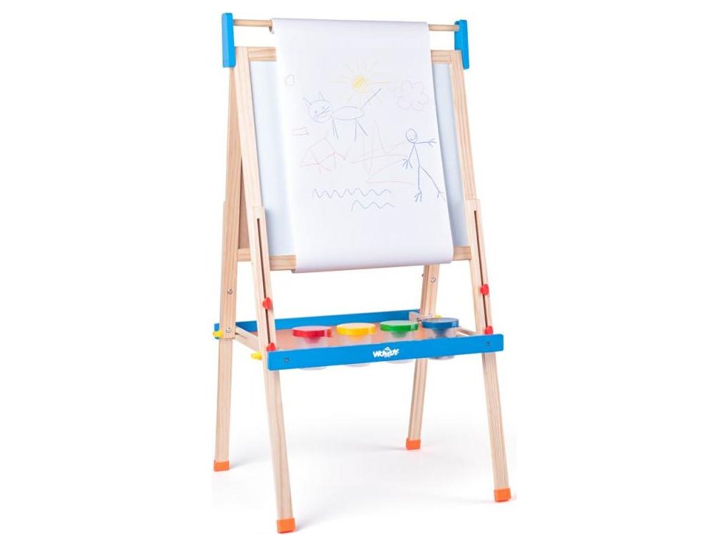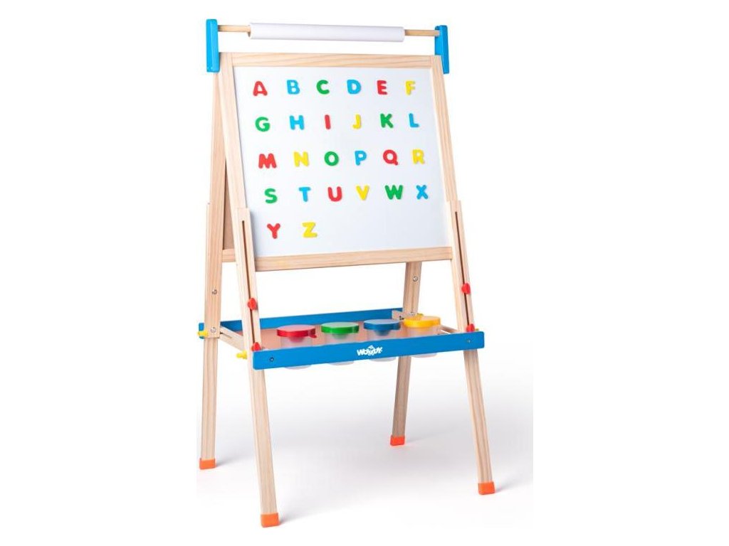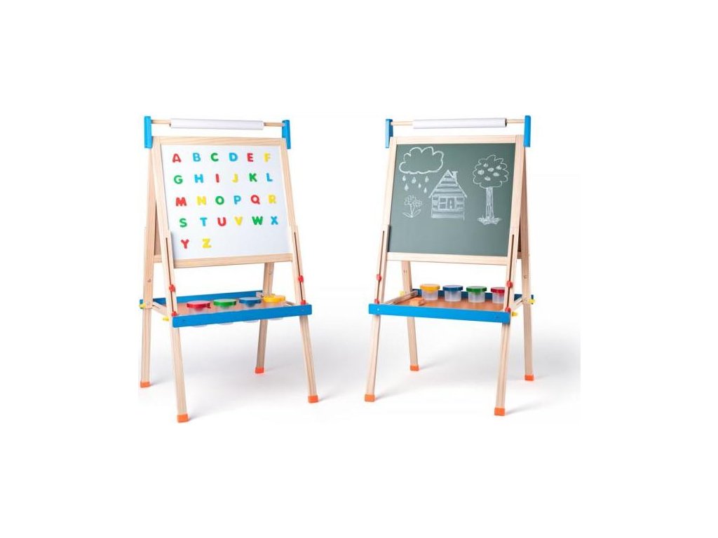 Oboustranná tabule značky Woody s nastavitelnou výškou. Z jedné strany je zelená plocha pro psaní křídami, z druhé bílá magnetická plocha pro psaní fixou. Nad tabulí je do konstrukce zabudovaná tyčka pro upevnění role papíru, který můžete odvíjet a malovat na ploše, kterou poskytují desky tabulí. Tabule obsahuje magnetická písmena, bílé křídy, fix, houbičku a kelímky na vodu a barvy.
