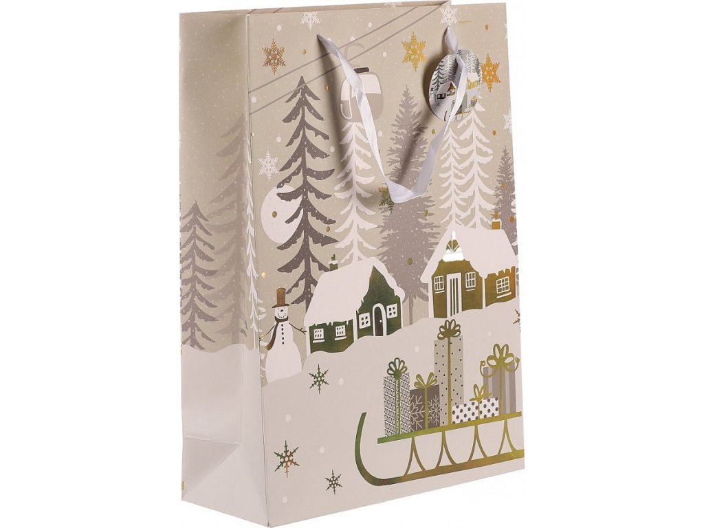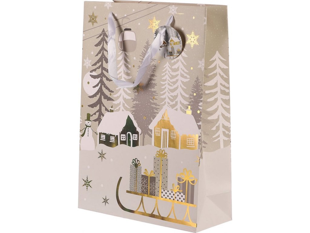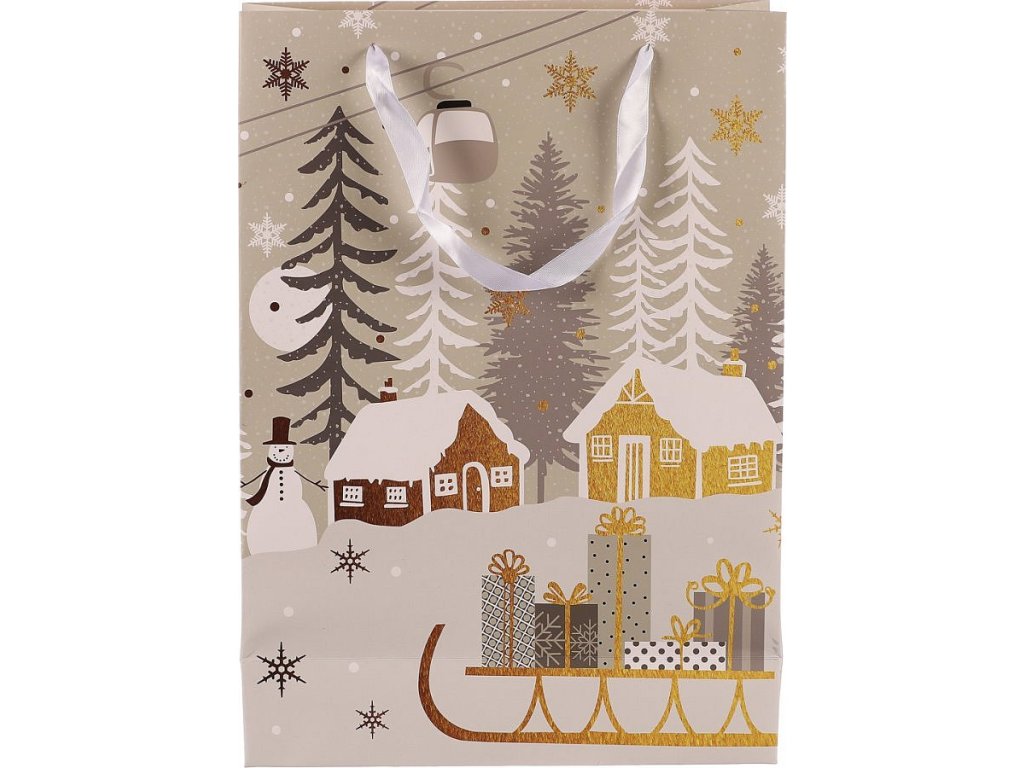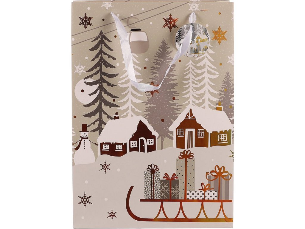 Vánoční papírové tašky, v tomto případě s motivem zimní krajiny a sáněk s naloženými dárky, jsou praktickým a elegantním řešením pro jednoduché, rychlé a efektivní umístění dárků. Už se nemusíte trápit s pracným balením do klasického papíru, ale jednoduše vložíte překvapení do tašky a máte hotovo! Díky svátečnímu vzoru získává váš dárek jedinečný vzhled, který obzvlášť potěší, tím spíše, když pro obdarovaného vyberete ten nejlepší z naší široké nabídky svátečních motivů.