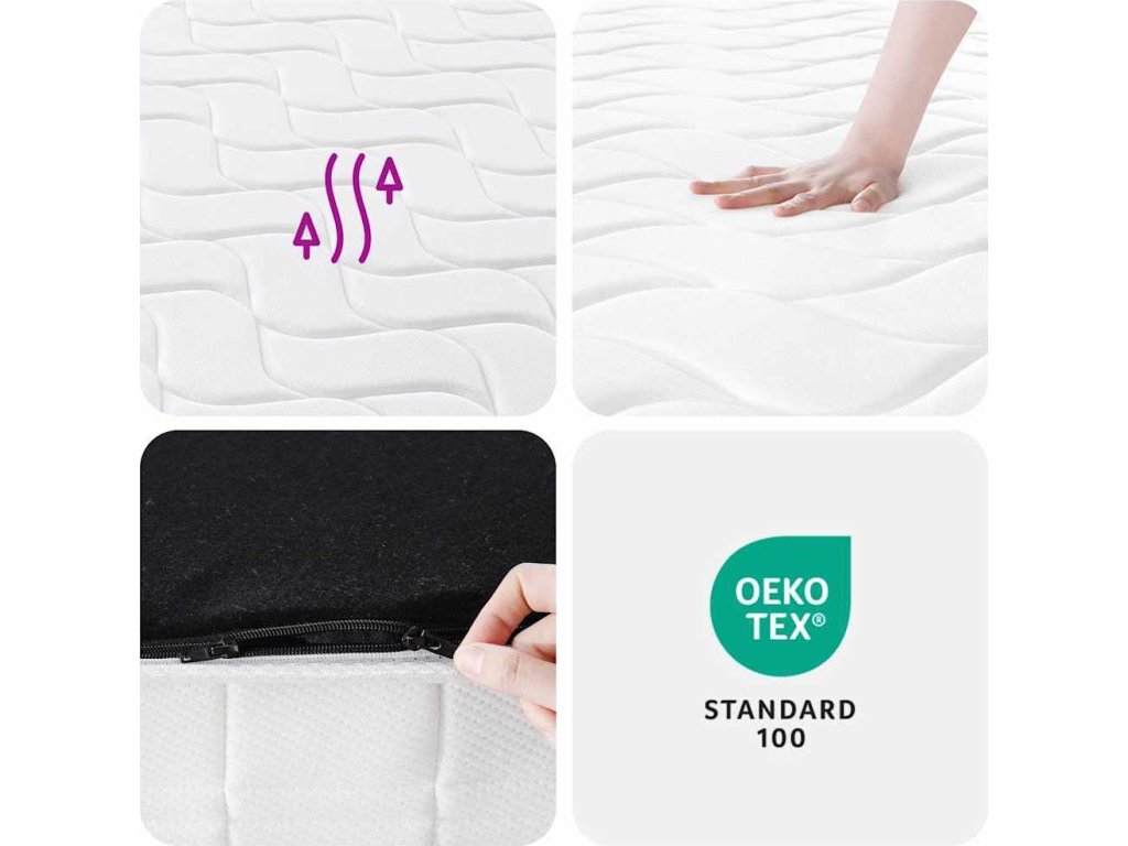 - Zvýšený komfort: Pružinová matrace má více vrstev, včetně pěnové, izolační a pružinové vrstvy. Tato kombinace zajišťuje mírnou až střední tvrdost a komfort pro všechny polohy při spánku. Matrace navíc účinně tlumí hluk a vibrace způsobené převalováním a otáčením, čímž zajišťuje klidný a nerušený spánek.