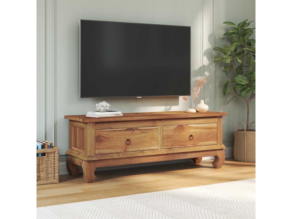 Tento televizní stolek z masivního teakového dřeva není jen kus nábytku – je to stylové a praktické řešení pro moderní obývací pokoje. Jeho obdélníkový tvar vytváří siluetu, která se skvěle doplňuje s přírodním dřevem, což přináší kombinaci jednoduchosti a elegance, inspirovanou vintage stylem. Skvěle využívá prostor a je kompaktní, takže nenarušuje estetiku vašeho pokoje.
