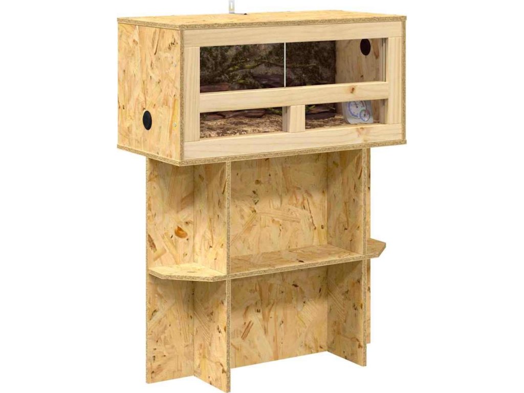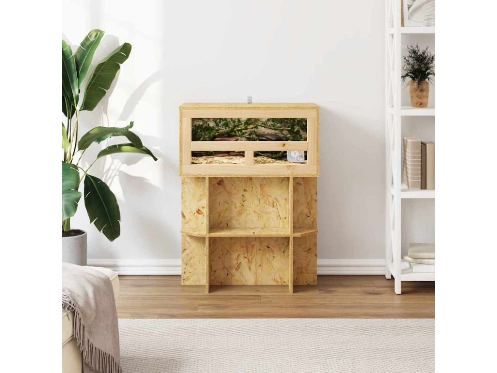 - Materiály: Vyrobené z pevného OSB a skla, toto terárium zaručuje odolnost a styl. Rám OSB spolu s průhlednými skleněnými panely tvoří solidní, vzdušnou konstrukci, která nabízí skvělou viditelnost. Tyto materiály usnadňují údržbu terária a přitom skvěle ladí s různými styly interiéru.