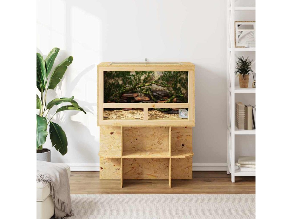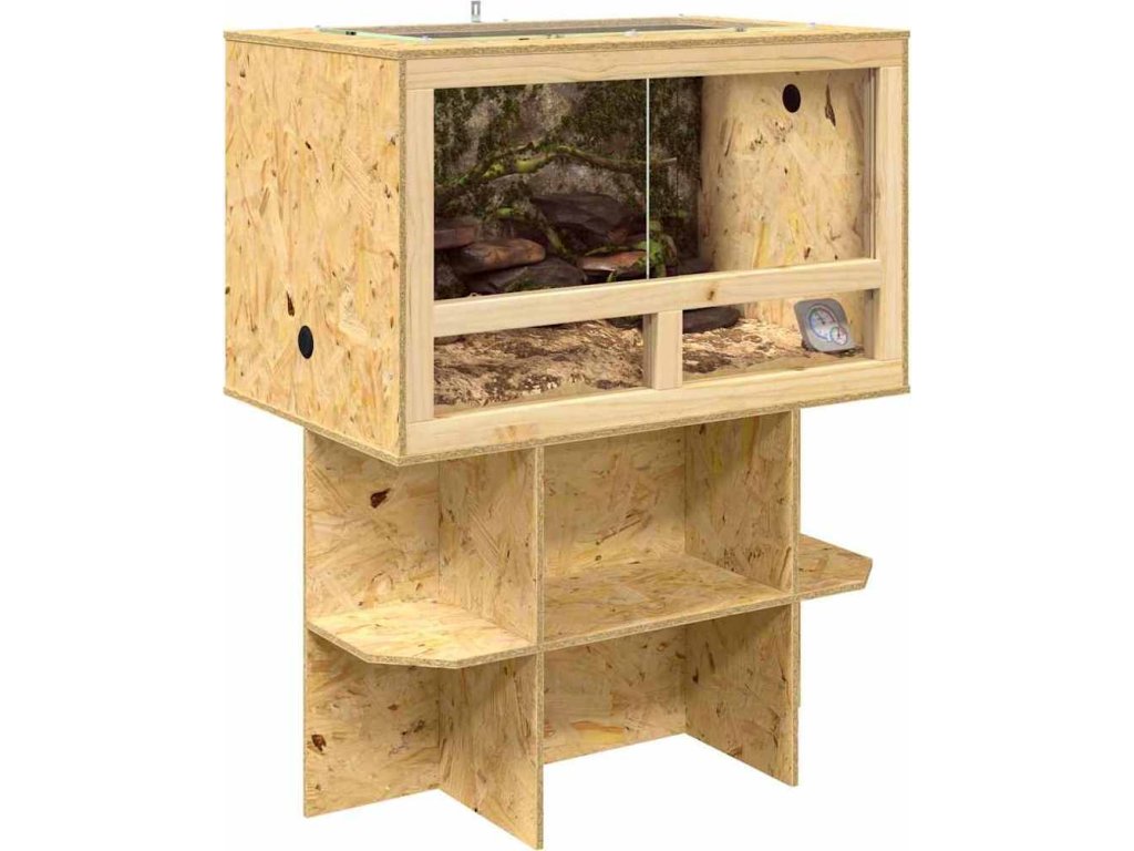 - Materiály: Vyrobeno z OSB a skla, tohle terárium je vizuálně atraktivní a praktické bydlení pro mazlíčky. OSB je vybráno pro svou odolnost, zatímco skleněné části nabízejí jasný výhled, což usnadňuje sledování zvířat.
