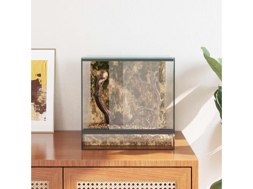 - Průhledné sklo: Hlavní materiál, sklo, je zpracované tak, aby poskytovalo neomezený výhled na plazy a obojživelníky. Hladké sklo zajišťuje elegantní vzhled a bezproblémovou integraci s moderním interiérem nebo zahradou.