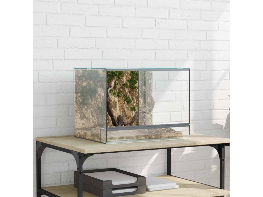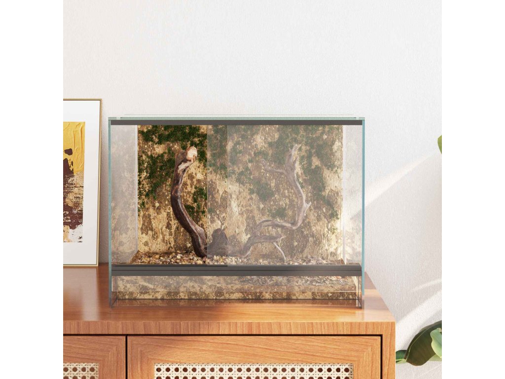 Tohle skleněné terárium je moderní kryt pro plazy a obojživelníky. Nabízí 360stupňový výhled na jejich habitat. Elegantní design z hladkého skla spojuje jednoduchost a funkčnost, takže se hodí do každého interiéru nebo zahrady. Sklo je odolné proti poškrábání, což chrání zvířata i samotný produkt, a zajistí vám vždy skvělý pohled dovnitř.