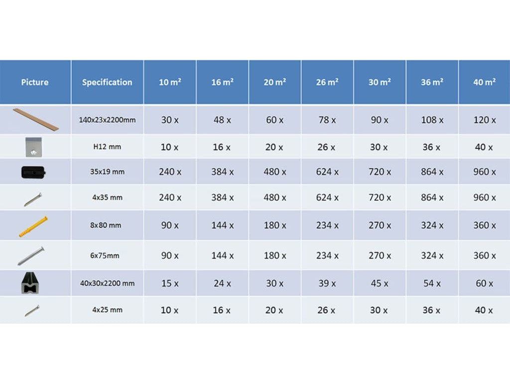 Tato kompletní sada terasových prken z WPC s příslušenstvím pokryje plochu o velikosti 30 m². Perfektně se hodí na terasy, balkóny a okolí bazénů či vířivek.
