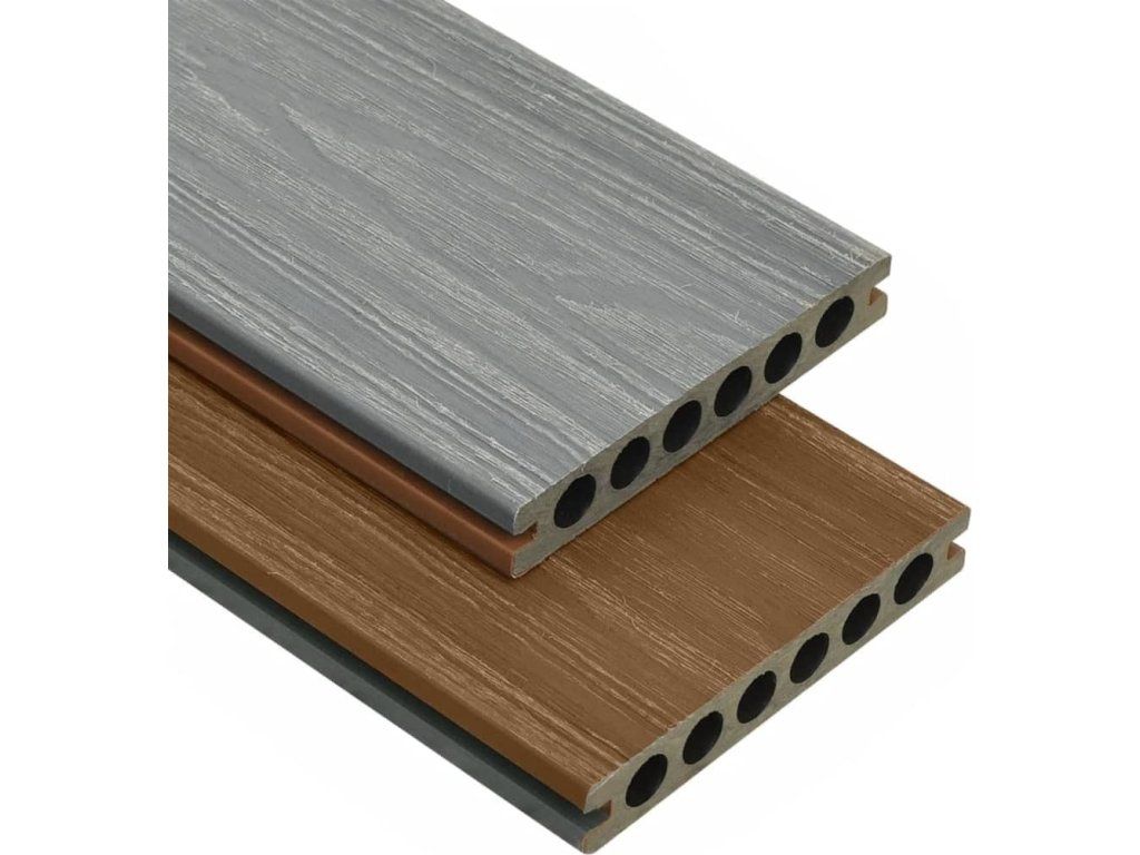 Terasová prkna jsou vyrobená z dřevoplastového kompozitu, skvěle vzdorují vodě a jsou vysoce odolná, takže vydrží i dlouhodobé používání. Vzhledem ke své mimořádné tloušťce 23 mm jsou nesmírně bytelná. Na rozdíl od běžných podlahových desek z WPC jsou tato dřevoplastová prkna koextrudovaná pro extrémní pevnost a odolnost. Jedná se o výrobní proces, při kterém je na vrchní část palubky nanesená další vrstva a posléze ražená, aby získala jedinečnou texturu dřeva s viditelnou kresbou. Každá strana desky má jinou barvu, jedna strana je hnědá a druhá šedá, takže si můžete vybrat finální barvu pokládky podle vašeho přání.