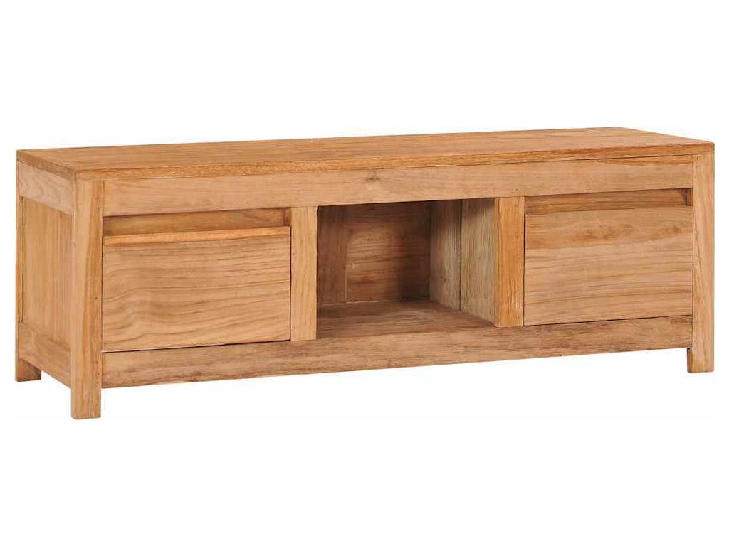 Tento rustikální TV stolek je zhotovený z masivního teakového dřeva, má tedy pevnou a odolnou konstrukci. Přírodním olejem ošetřený povrch je hladký, jen tak se nepoškrábe a zároveň vám usnadní čištění a pravidelnou péči. Je vybaven 2 většími zásuvkami, kam si můžete uložit různé nezbytnosti, zatímco 1 otevřená přihrádka vám poslouží k uspořádání multimediálních zařízení, herních konzolí, CD a časopisů.