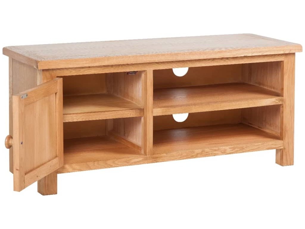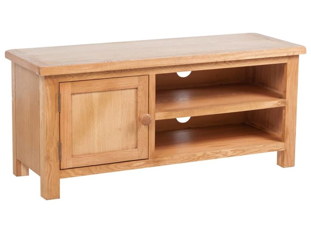 Tento televizní stolek je zručně zhotoven z odolného masivní dubového dřeva a je vysoce funkční. Jeho součástí je skříňka se dvěma policemi pro drobnosti a další dvě police pro přehrávače médií nebo herní konzole a reproduktory.