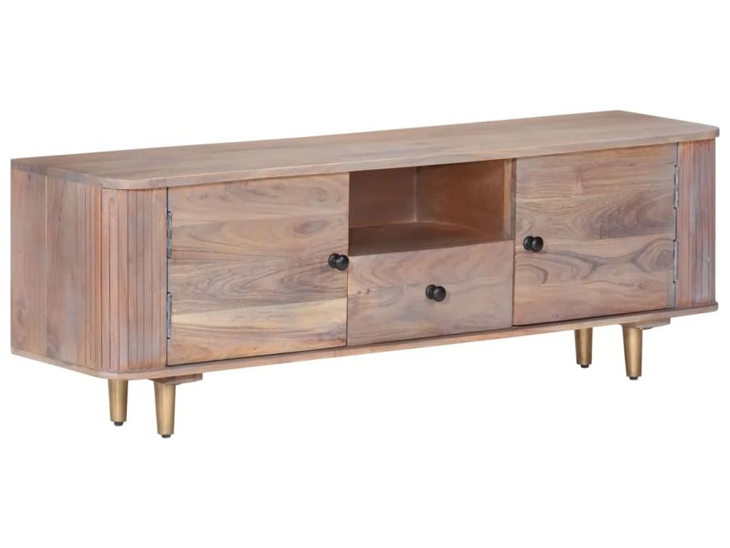 TV stolek je vyrobený z masivního akáciového dřeva, tvrdého dřeva s hustou kresbou, je tedy stabilní a odolný. Železné nohy zaručují mimořádnou stabilitu a robustní horní část lze použít k vystavení dekorativních předmětů. Úložná přihrádka a zásuvky nabízí dostatek místa pro ukládání vašich multimediálních zařízení, knih a celé řady dalších věcí.