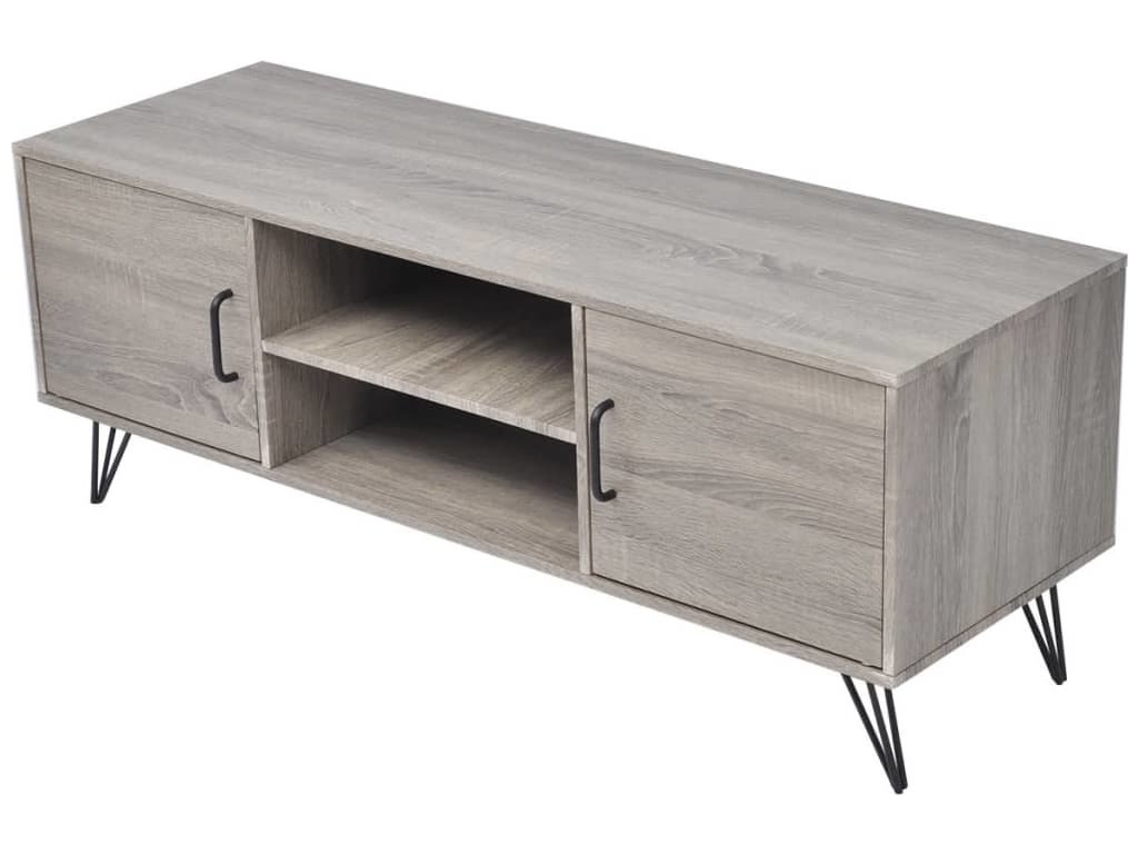 Šedá barva dodá této skříňce rustikální vzhled a dojem, takže se bude hodit do různých stylů zařízení. Tento televizní stolek je vyroben z vysoce kvalitní MDF a má pevné ocelové špičaté nohy, takže je velmi robustní a odolný. Prostorné přihrádky a poličky se spoustou místa vám poslouží k přehlednému uložení vašeho DVD přehrávače, herní konzole, streamovacího zařízení a nosičů medií. Navíc dva praktické kabelové vývody umožňují uklidit všechny kabely elegantně z dohledu.