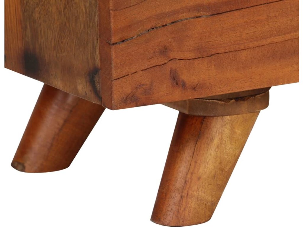 TV skříňka je vyrobená z masivního recyklovaného dřeva, které pochází z trámů, podlah a podpěrných nosníků ze starých budov určených k demolici. Může tedy obsahovat celou řadu různých typů dřeva, jako je borovice, teak, buk, dub, cedr, mangovník, akácie atd. Recyklované dřevo tak nabývá vlastností všech těchto rozličných druhů dřevin. Navíc je již zestárlé, ošlehané a vyschlé, takže se nesmršťuje ani neohýbá. Známky opotřebení a zřetelná textura dřeva vypovídají o jeho bohaté historii a propůjčují stolku jedinečný vzhled.