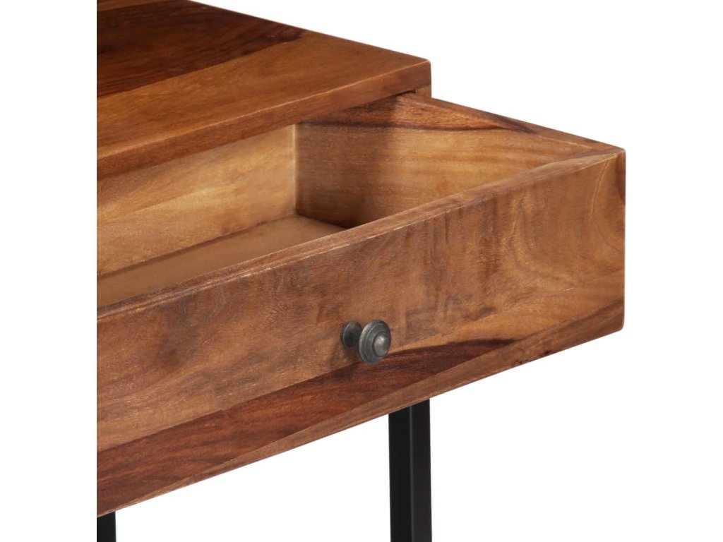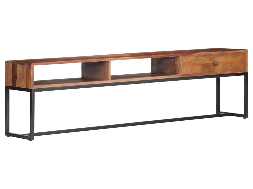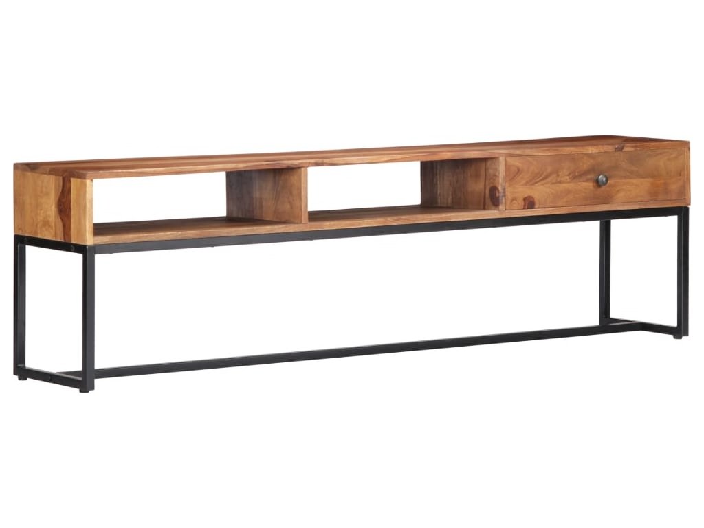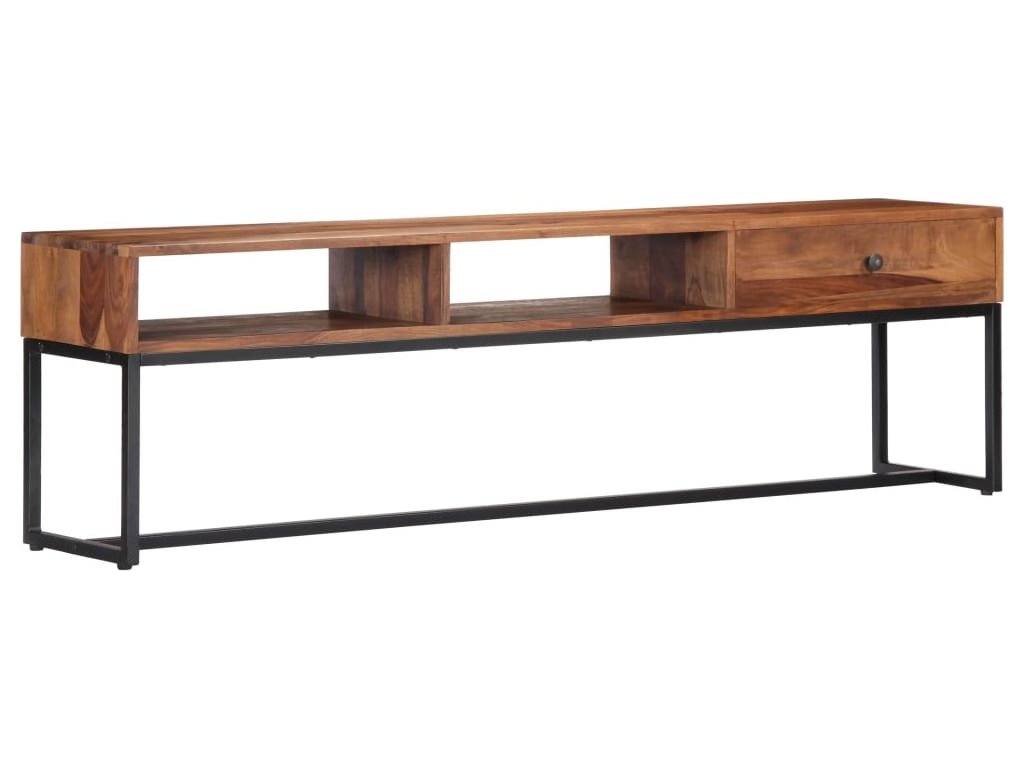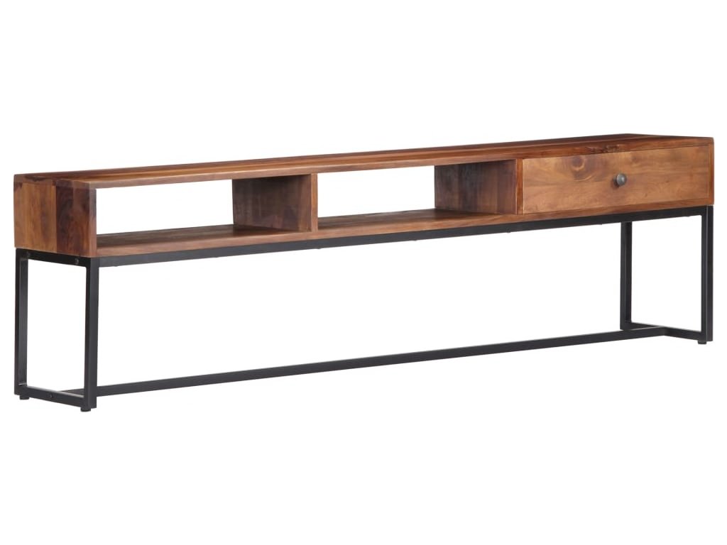 TV stolek ve vintage stylu je vyrobený z masivního akáciového dřeva a je ideálním nadčasovým doplňkem do vašeho domova. Akácie, jemuž se někdy také říká rosewood nebo palisandr, je tropické tvrdé dřevo proslulé svou bohatou texturou. Každá fáze výrobního procesu je prováděna s mimořádnou péčí, ať už se jedná o leštění, natírání nebo lakování. Pevný ocelový rám zajišťuje výtečnou stabilitu a odolnost stolku. Televizní skříňka disponuje zásuvkou, kam si můžete uložit nejrůznější drobnosti, a otevřenými přihrádkami pro uložení multimediálních zařízení, herních konzolí a časopisů.