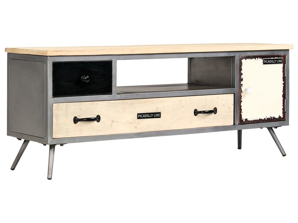 Stolek je vyroben z masivního mangovníkového dřeva, které bylo vyleštěno a nalakováno. Překrásná povrchová úprava dřeva mu propůjčuje rafinovaný vzhled. Díky nádherné kresbě dřeva je každý kus nábytku zcela jedinečný a lehce odlišný od ostatních. Tato TV skříňka disponuje pevnou a stabilní deskou, na kterou můžete umístit svou televizi, košík s ovocem, vázu nebo jiné dekorativní předměty. Nízká skříň je vybavena 2 zásuvkami, 1 přihrádkou a 1 skříňkou, jež vám poskytnou spoustu místa pro ukládání vašich multimediálních zařízení, knížek a dalších nejrůznějších věcí. Ocelový rám nejen přispívá k odolnosti a stabilitě stolku, ale zvýrazňuje také jeho industriální šarm. Montáž je snadná.