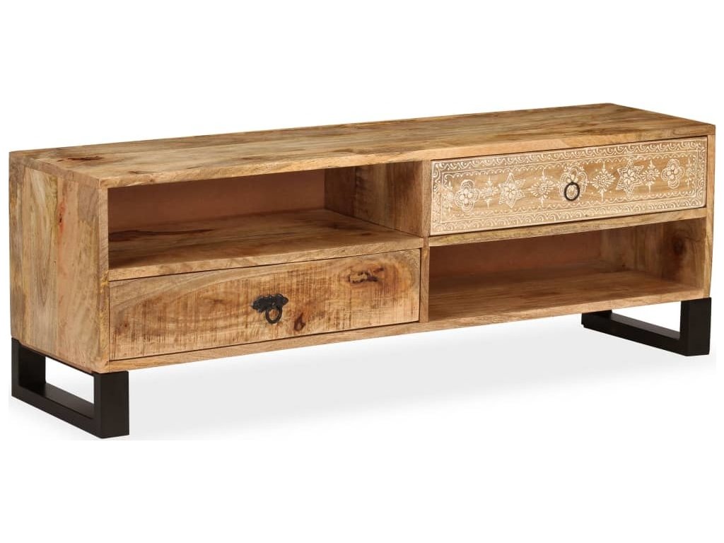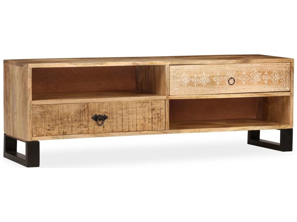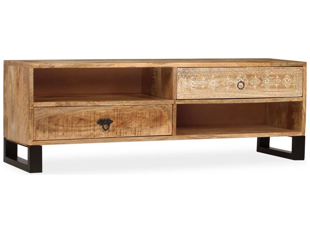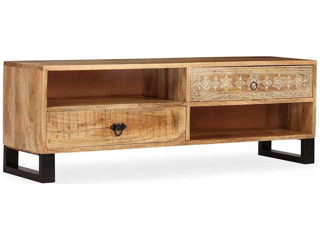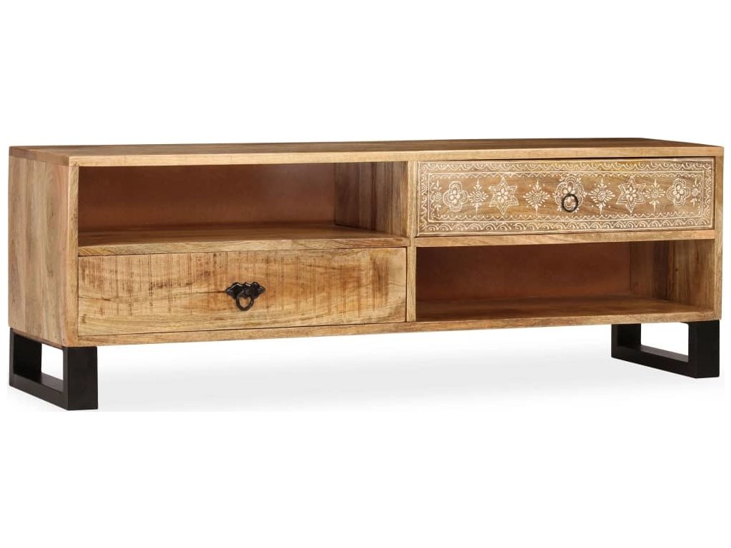 TV stolek je ručně vyroben z mangovníkového a pražcového dřeva, které je pevné a zároveň krásně vypadá. Ručně malované ornamenty navíc umocňují jeho okázalý retro styl. Každá fáze výrobního procesu je prováděna s největší pečlivostí, ať už se jedná o leštění, natírání anebo lakování. Řemeslné zpracování a překrásná kresba dřeva činí každý kus nábytku zcela jedinečným a lehce odlišným od ostatních. Design stolku disponuje 2 policemi a 2 zásuvkami, poskytne vám tedy spoustu místa pro přehledné uspořádání vašeho DVD přehrávače, herní konzole, satelitního zařízení, kolekce CD a DVD apod., a to tak, abyste měli vše po ruce. TV stolek můžete rovněž použít jako nízkou skříňku anebo skříňku pro multimediální zařízení. Ocelové nohy nejen přispívají ke stabilitě stolku, ale dodávají mu také industriální kouzlo. Montáž je snadná.