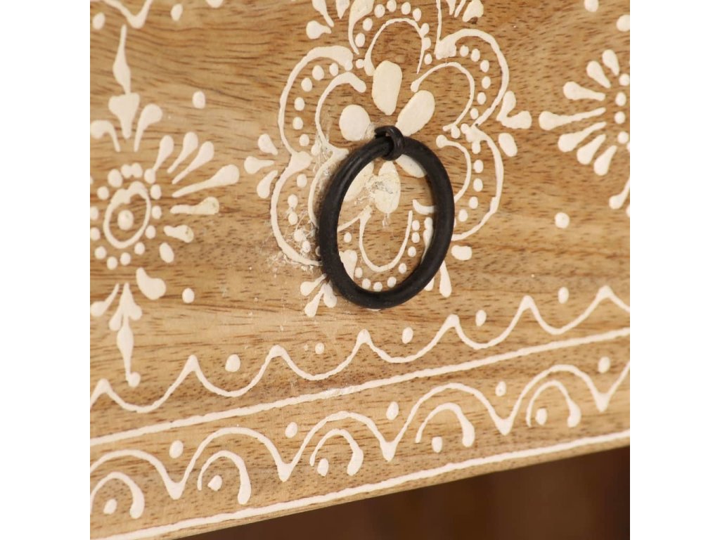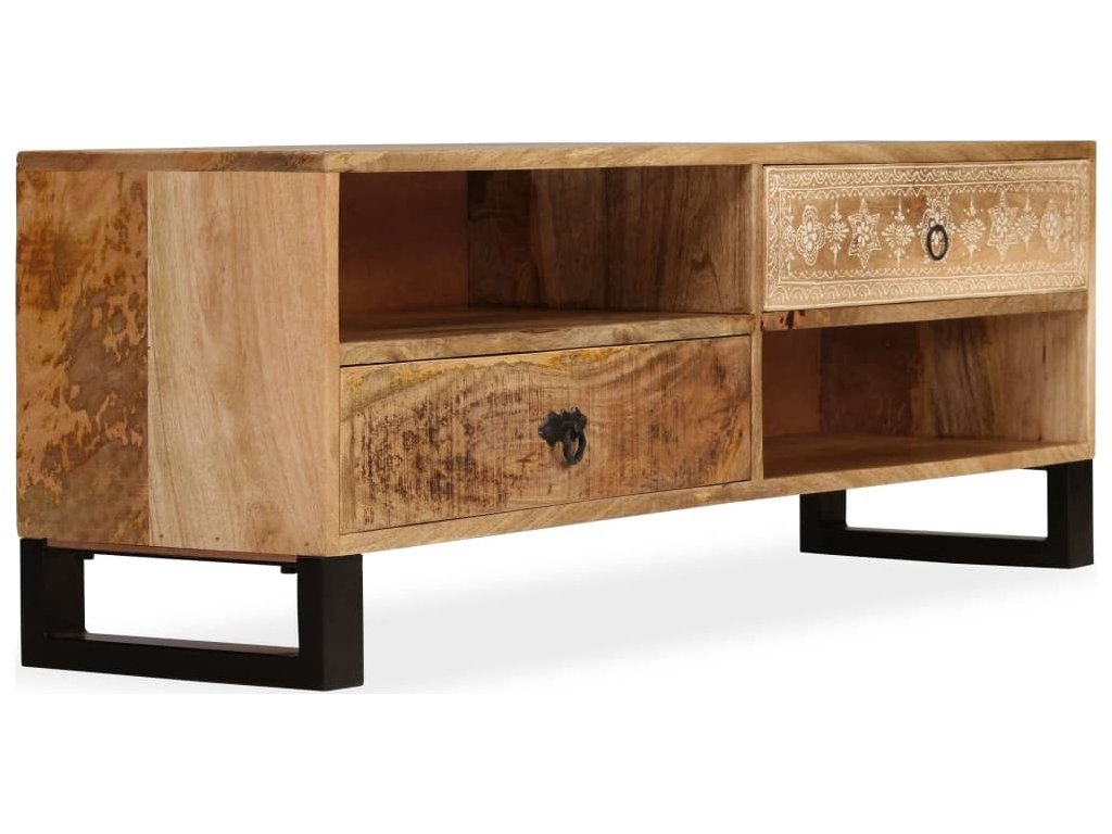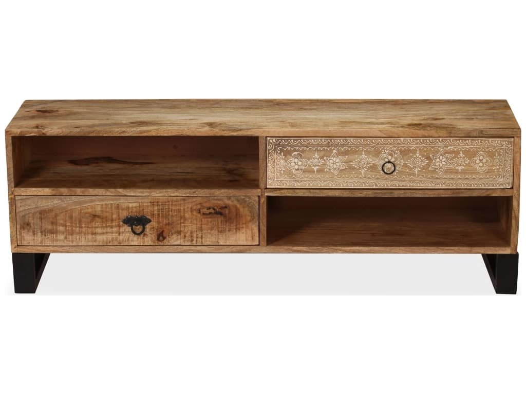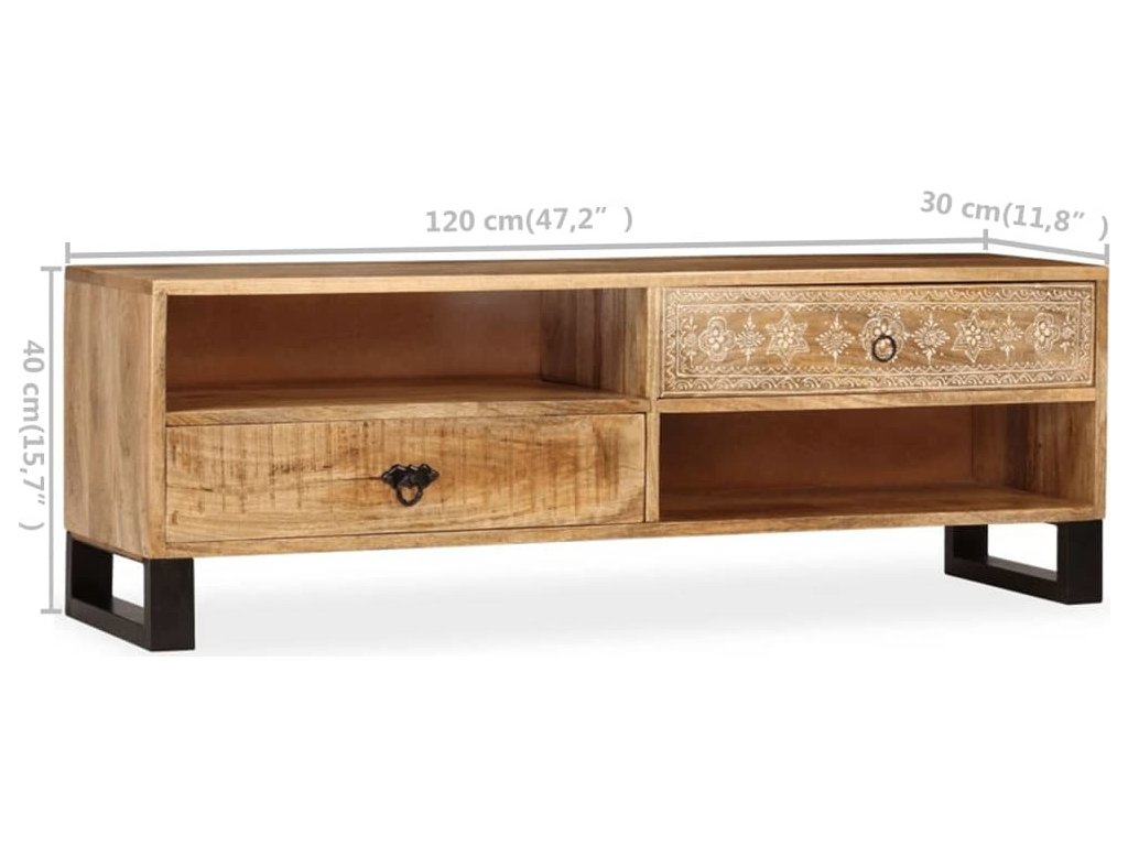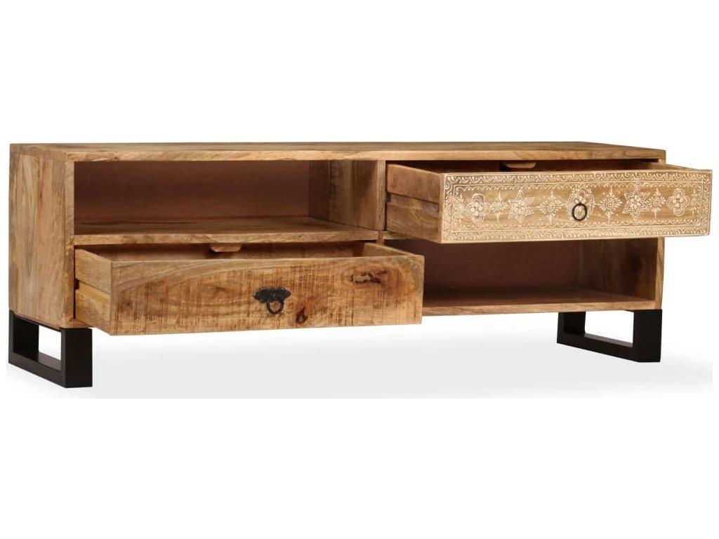 TV stolek je ručně vyroben z mangovníkového a pražcového dřeva, které je pevné a zároveň krásně vypadá. Ručně malované ornamenty navíc umocňují jeho okázalý retro styl. Každá fáze výrobního procesu je prováděna s největší pečlivostí, ať už se jedná o leštění, natírání anebo lakování. Řemeslné zpracování a překrásná kresba dřeva činí každý kus nábytku zcela jedinečným a lehce odlišným od ostatních. Design stolku disponuje 2 policemi a 2 zásuvkami, poskytne vám tedy spoustu místa pro přehledné uspořádání vašeho DVD přehrávače, herní konzole, satelitního zařízení, kolekce CD a DVD apod., a to tak, abyste měli vše po ruce. TV stolek můžete rovněž použít jako nízkou skříňku anebo skříňku pro multimediální zařízení. Ocelové nohy nejen přispívají ke stabilitě stolku, ale dodávají mu také industriální kouzlo. Montáž je snadná.