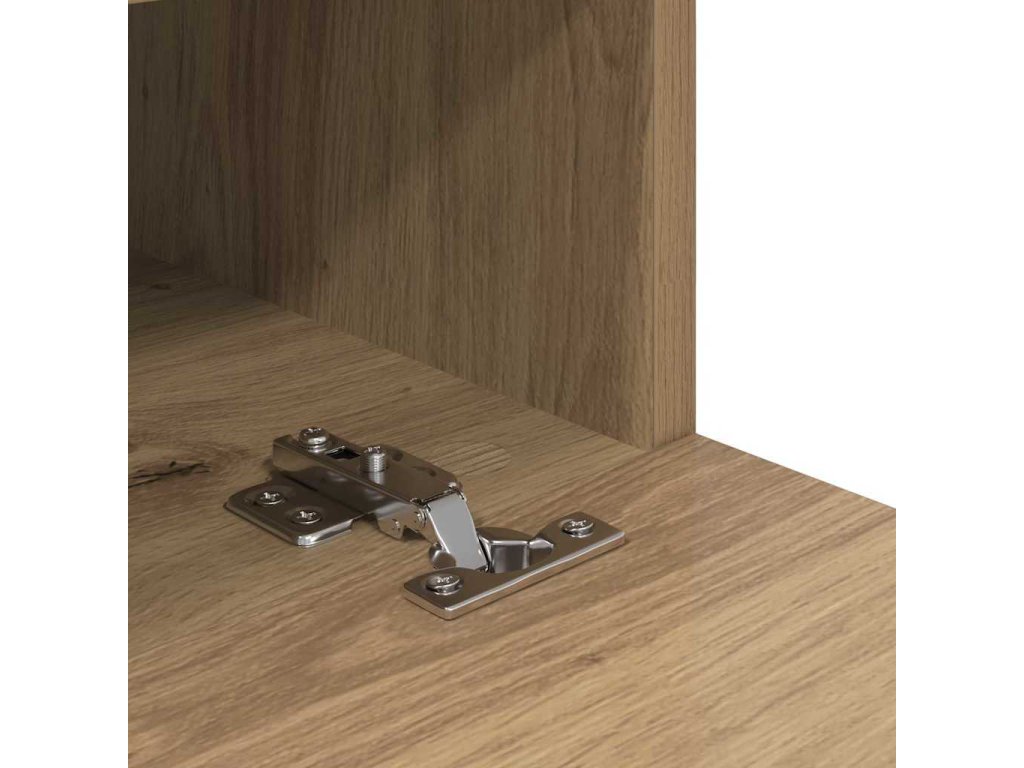 - Funkční poličky: Skříň má police z inženýrského dřeva, které se hodí na média nebo dekorace. Pomáhá organizovat gadgety v obýváku a dodává praktický vzhled.