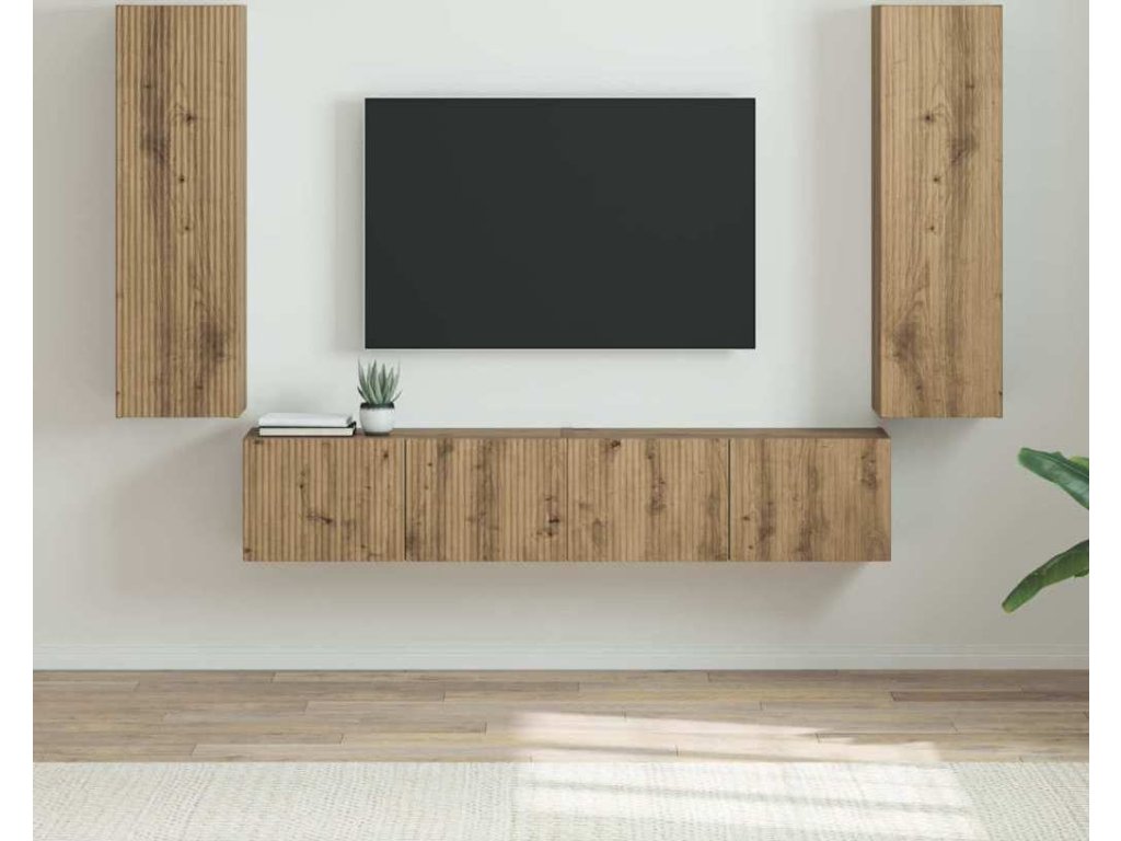 Tahle moderní TV nástěnná skříň je super praktickým a prostor šetřícím řešením pro každý obývák, skvěle spojuje pohodlí a styl. Díky elegantnímu a minimalistickému designu se stane středobodem vašeho domova, poskytuje funkčnost i estetickou přitažlivost. Jako nástěnná jednotka má spoustu úložného prostoru pro zábavní systémy a dekorace, takže vše bude na svém místě. Inženýrské dřevo zaručuje odolnou konstrukci, která vydrží každodenní používání a zachovává si přesto sofistikovaný vzhled.