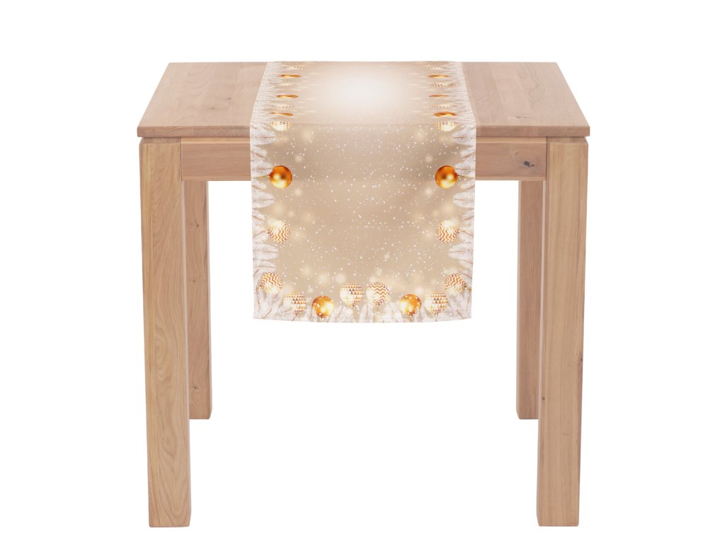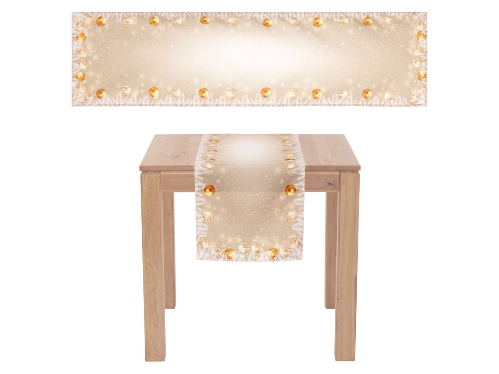 Jemný dekor v dokonalém spojení elegance a vánočních prvků dělá z tohoto běhounu jedinečný doplněk pro váš interiér nachystaný na nejkrásnější svátky v roce. S motivem ozdobných koulí rozprostřených na zlatém podkladu se bude vyjímat jak na konferenčním, tak i jídelnovém stole nebo na komodě stojící poblíž ozdobeného stromku. Lze snadno kombinovat s dalšími textiliemi a dekoracemi.