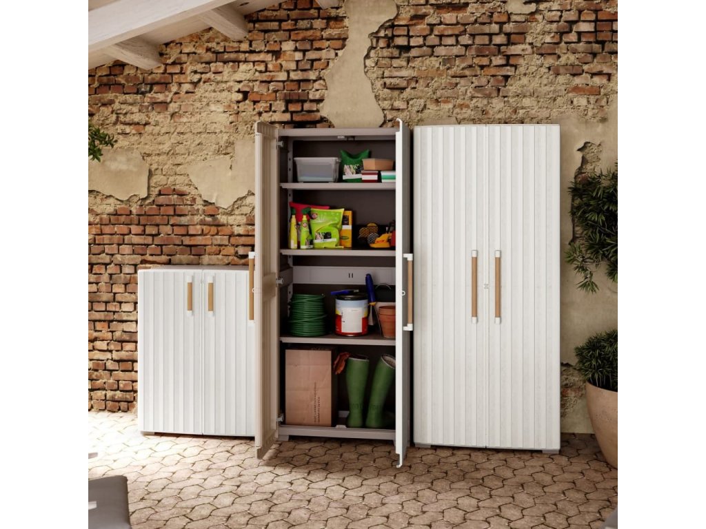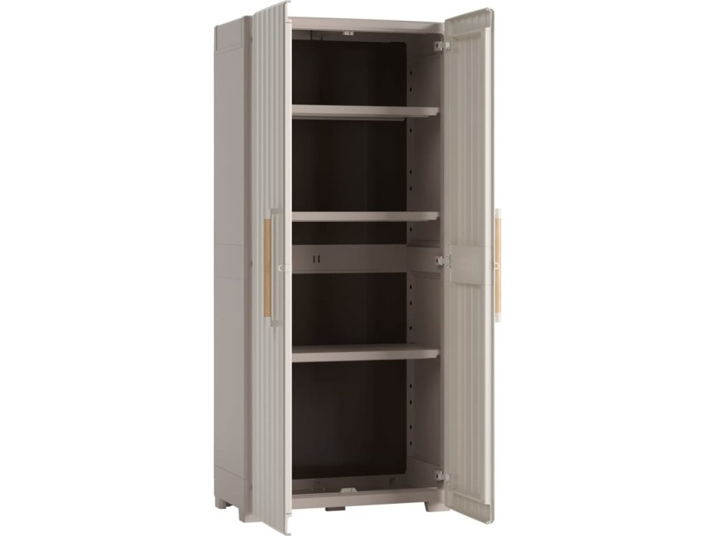 - 3 nastavitelné police: Venkovní skříň je vybavena třemi nastavitelnými policemi a nastavitelnými nožičkami. Každá police má navíc pod sebou další podpěrnou tyč.