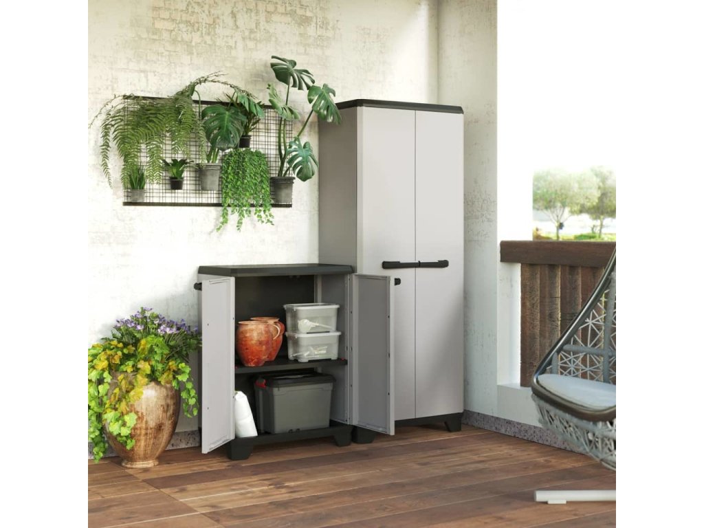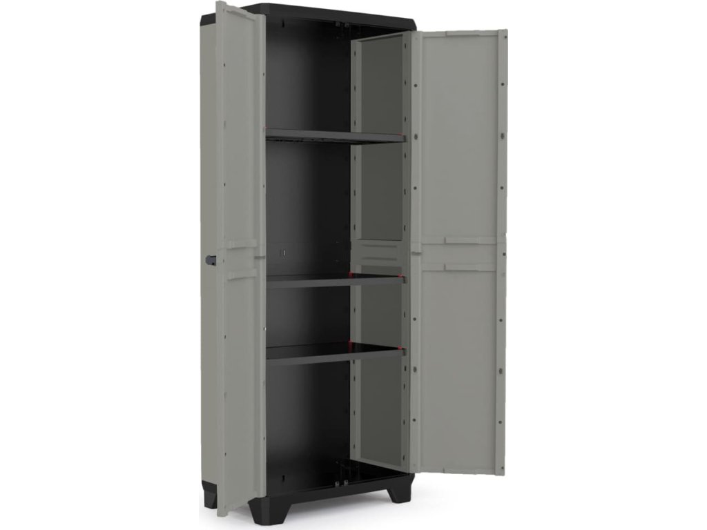 Skříň obsahuje celkem 3 přídavné police - každá s výraznou nosností až 15 kg, které přijdou vhod pro výrazně těžší předměty všeho druhu. Lze ji tedy využít pro skladování dílenského nářadí či zahradnických potřeb, kdy přijde vhod pro uložení náčiní s dlouhou násadou, které by se jinam nevešlo. Díky svému provedení v univerzální šedé barvě zapadne do každého prostoru bez ohledu na jeho konceptuální styl.