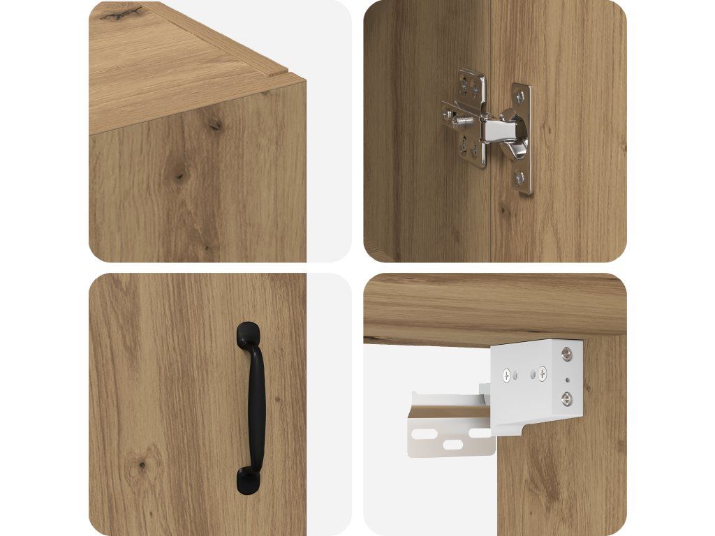 - Materiály: Robustní kompozitní dřevo zajišťuje trvanlivost a styl. Je odolná vůči každodennímu opotřebení a snadno se udržuje, takže skříň si stále zachovává svěží vzhled a hodnotu.