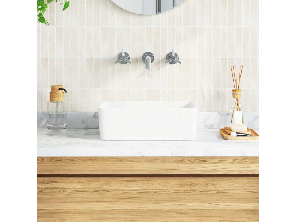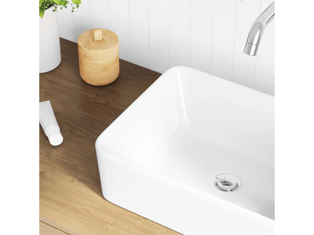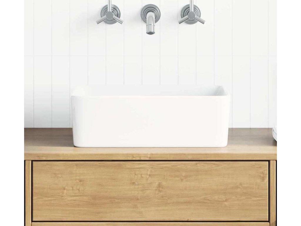 Toto obdélníkové umyvadlo je vyrobeno z keramiky a představuje stylový a nadčasový doplněk do každé koupelny, umývárny, šatny nebo na toalety.