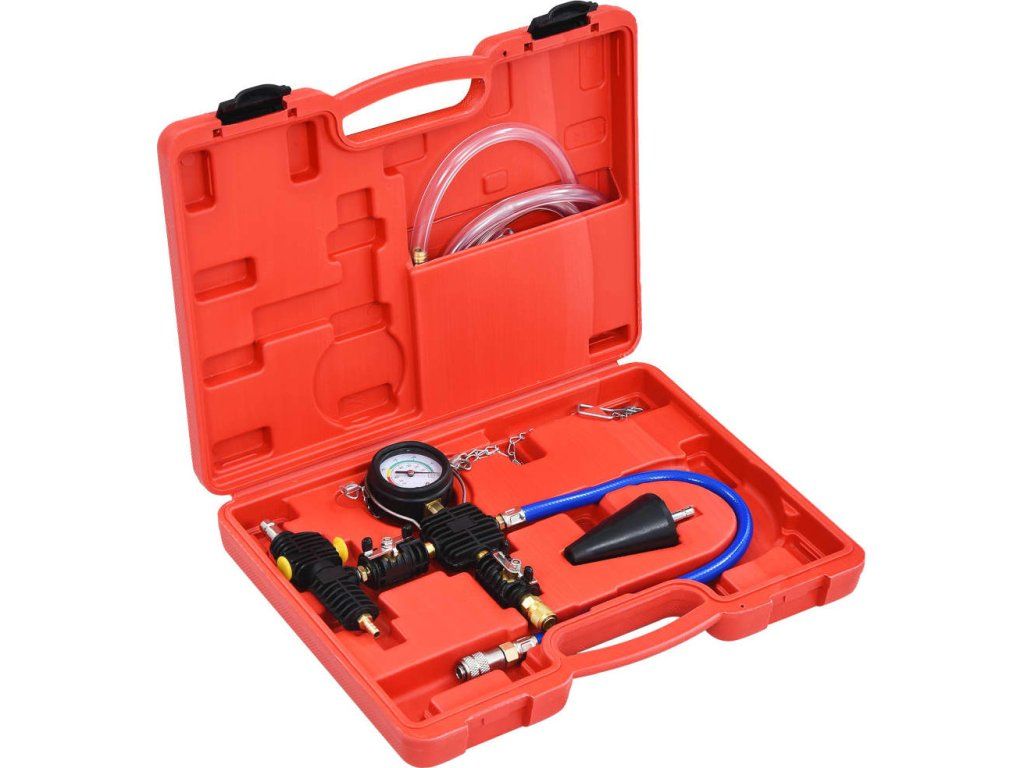 Tato souprava se obejde bez dodatečného odvzdušňovacího a proplachovacího systému pro odstranění vzduchových kapes. Obsahuje také flexibilní hadici pro práci na těžko přístupných spojích. Manometr má gumové ochranné pouzdro a přetlakový ventil. Součástí je i univerzální adaptér, který lze použít na chladičích většiny aut, SUV, dodávek a lehkých nákladních vozidel. Vysoce odolné pouzdro z foukaného plastu vám dobře poslouží pro bezpečnou a jednoduchou přepravu a skladování.