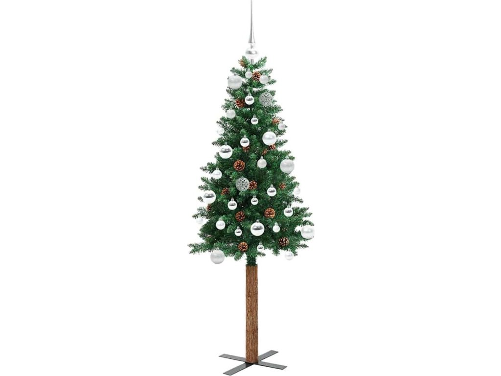 - Dekorativní s borovicovými šiškami a ozdobnými koulemi, realistické větvičky, skutečný dřevěný kmen