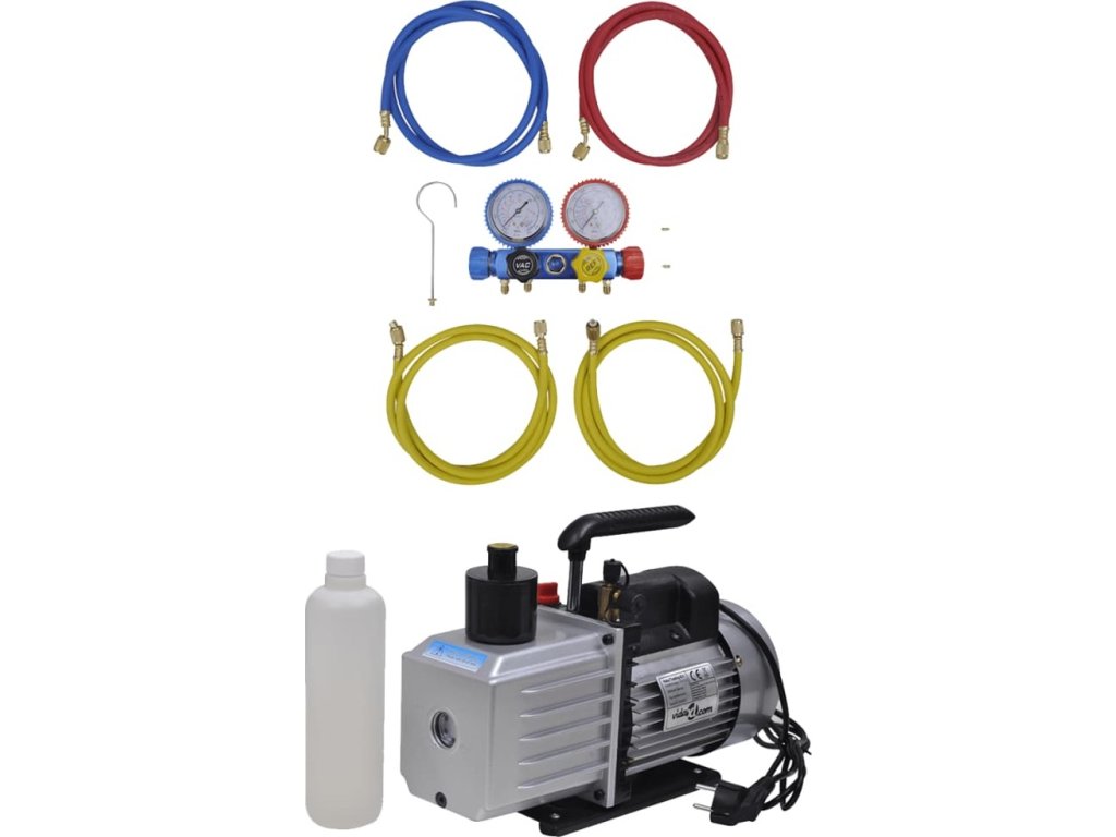 Čerpadlo vytváří podtlak, který umožňuje následné plnění klimatizačního systému chladivem. Čerpadlo má hliníkové pouzdro a praktické okénko pro okamžitou kontrolu hladiny oleje. Má také integrované madlo pro snadné přenášení. Přiložená 4cestná sada na měření je vhodná pro plnění a kontrolu klimatizačních systémů tím, že poskytuje údaje o tlaku v systému. Je vhodné pro použití na všech klimatizacích automobilů, stejně jako komerčních a domácích klimatizačních chladicích systémech. Barevně označená měřidla jsou jasná a snadno čitelná a jsou uzavřena v ochranném plášti, aby se zabránilo poškození. K rychlému a snadnému zavěšení měřidel můžete použít integrovaný ocelový hák. Sada měřidel má odolnou konstrukci.