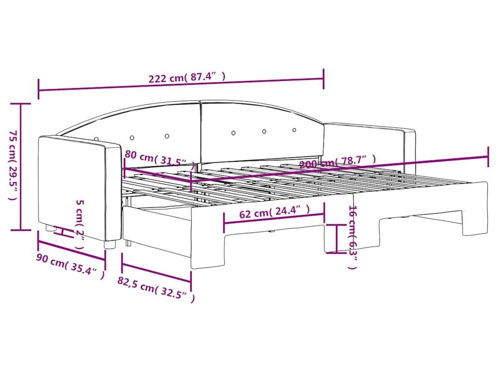 - Rozměry (nevysunuté): 222 x 90 x 75 cm (D x Š x V)
